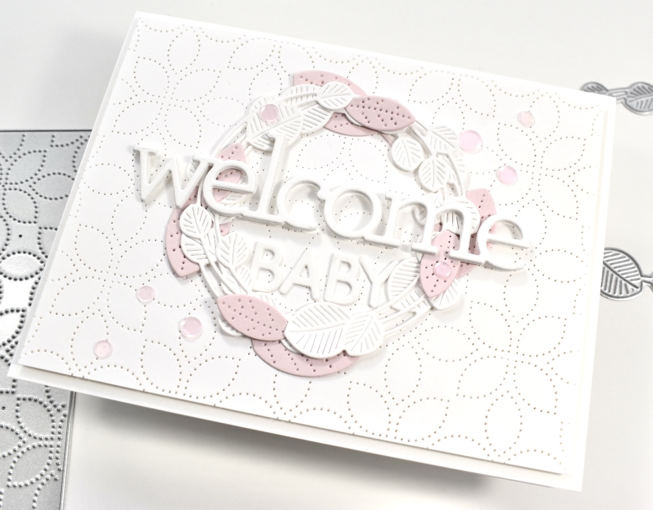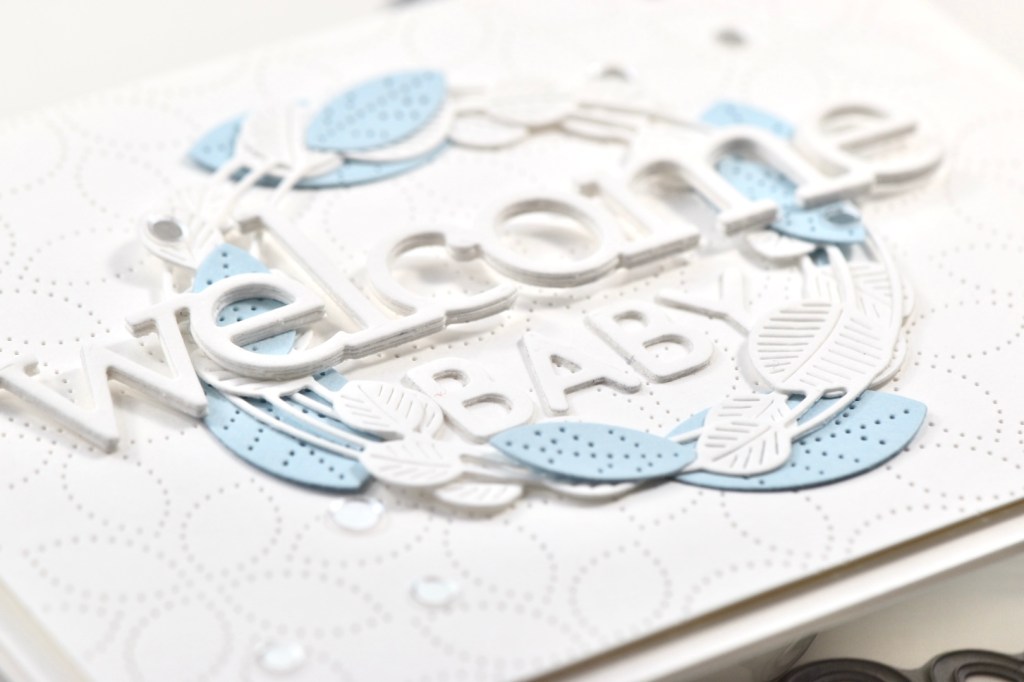 See what I mean? A lot of die cutting! I adhered the four Welcome die cuts together using Craft Tacky Glue, and the two letters for Baby. Once I figured out the placement of the Etched Eucalyptus Wreath, I glued those two together using only four points. I wanted to be able to tuck the Detail Elm Leaves in the nooks and crannies of the wreath.