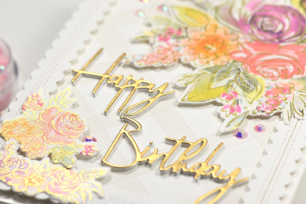 I used the PinkFresh Studio Stitched Scallop Rectangles to cut a panel of 110lb cardstock and die cut the Happy Birthday sentiment from the Classic Words die set. I cut the sentiment three times from 110lb cardstock and once from gold cardstock. Why? Because dimension is life! I will never stop saying that! I adhered all of my sentiment pieces together using Craft Tacky Glue.