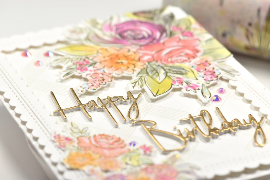 I just need to say … This washi is GORGEOUS! Moving on, I played around with the positioning of my sentiment and flowers to get the perfect placement and then adhered my sentiment to the panel using Craft Tacky Glue and adhered my floral pieces using foam tape. I trimmed the excess off with scissors.