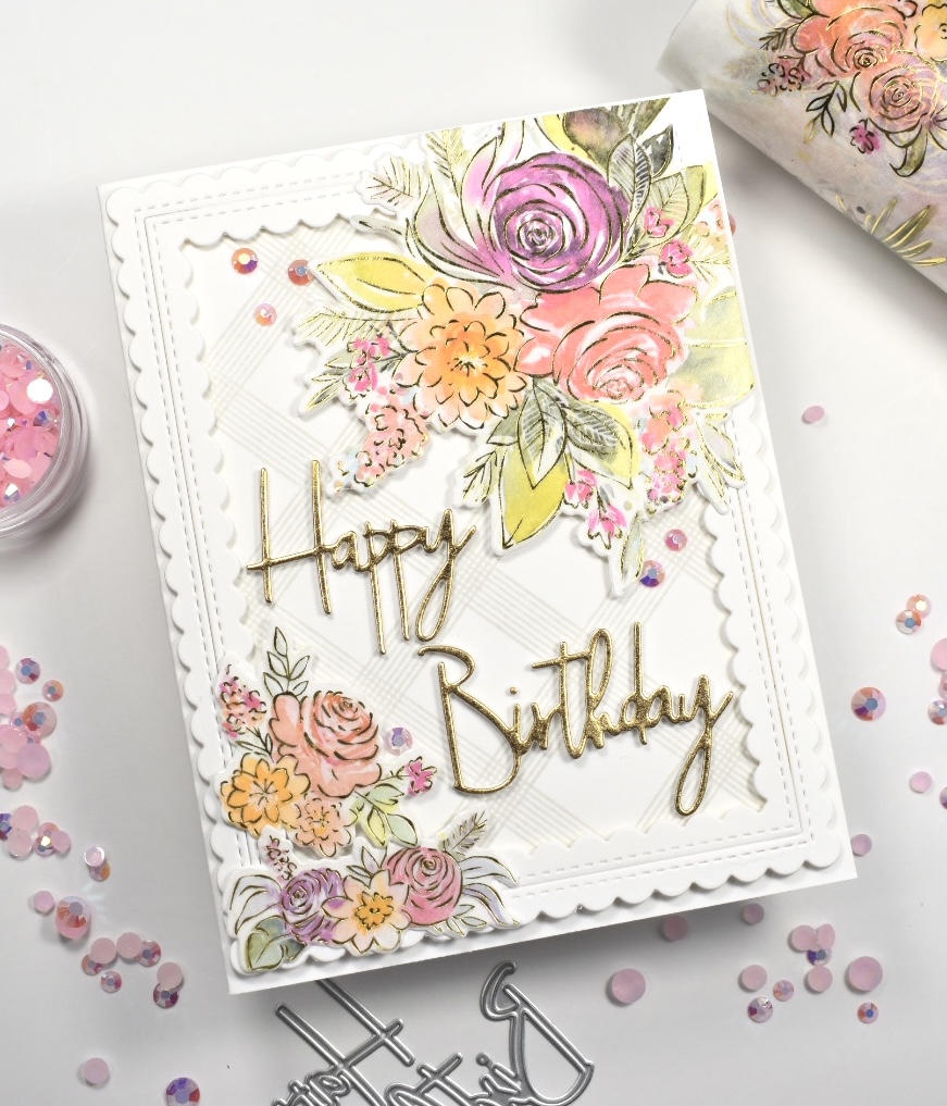 I just received my PinkFresh Studio shipment, which included the new Joyful Bouquet stamp, die and washi set, and I had to play right away! To begin my project I rolled out this beautiful washi onto some Neenah Classic Crest 110lb cardstock and used the coordinating die to cut all of the pieces out.