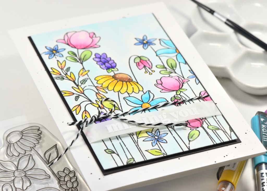 I had to put my Karin Brushmarkers to work on today’s project. To begin, I stamped the Floral Garden image on a piece of Fluid Hot Press Watercolor Paper with VersaFine Onyx Black ink and heat embossed it using Ranger Clear Embossing Powder. I taped my image down to a board using masking tape to prevent warping. My board just happens to be a $2.19 clipboard from Target .. but hey, it gets the job done!