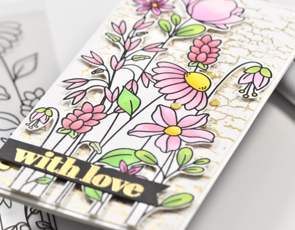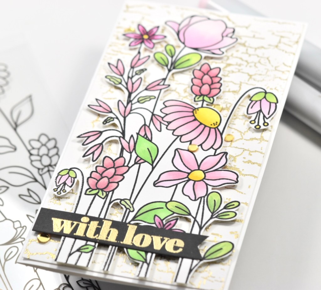 For today’s card, I’m showcasing the new stamp set Floral Garden. If you like to color or paint, this one’s for you! I had in my mind that I wanted all of the flowers to be pink, and I wasn’t sure how it was going to look, but sometimes you just have to jump in feet first right?! To begin my project, I stamped the floral image on Neenah Classic Crest 80lb cardstock using VersaFine Onyx Black ink and heat embossed it with Ranger Clear Embossing Powder. Once that was done, I started coloring the image with Copic markers YG05, YG07, YG13, YG17, G43, RV00, RV02, RV10, RV11, RV13, RV19, RV32, RV34, RV52, RV55, R81, R83, Y08, Y13 and Y15.