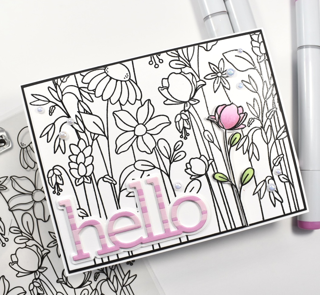 I trimmed my black and white stamped panel down to 4″ x 5.25″ and adhered my single flower on top of the same flower using 3M Foam Tape. I then adhered the Hello sentiment using glue to the bottom left. I mounted this panel onto black cardstock, because I like the contrast that it gives. Everything was then adhered to my card base, which is Neenah Classic Crest 110lb cardstock.