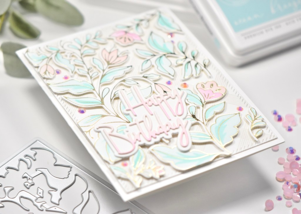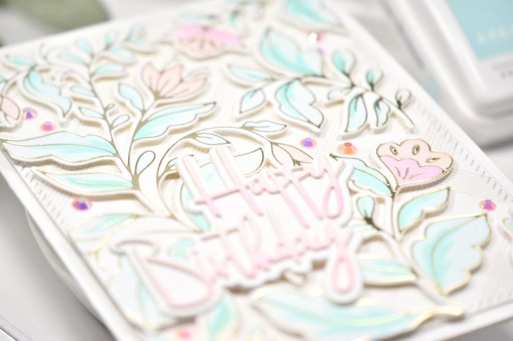 I began my project by foiling the Folk Garden plate on a panel of Neenah Classic Crest 110lb cardstock using the Spellbinders Glimmer Hot Foil System. I then used the coordinating stencils to add color using PinkFresh Studio Inks Ocean Breeze, Aquamarine, Ballet Slipper and Sparkling Rose and cut that panel using the coordinating die.