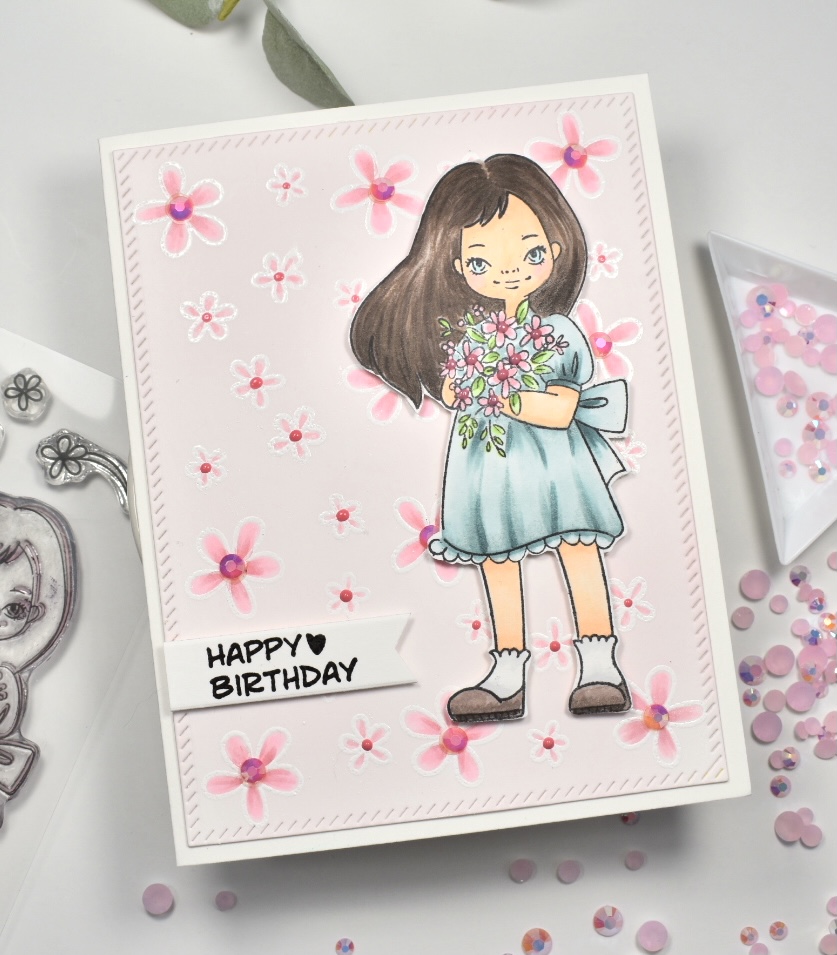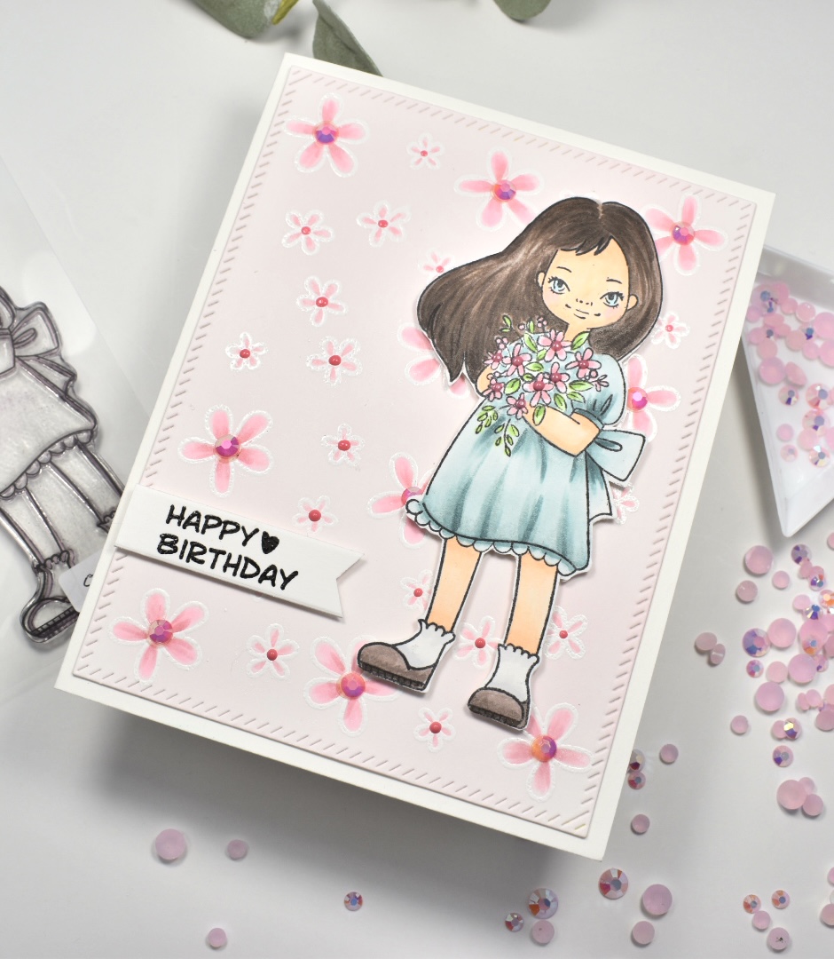 I very lightly ink blended Distress Oxide Spun Sugar over the entire panel and began coloring the stamped flowers using Copic Markers RV00, RV10, RV11 and RV32. I went back to my Misti and stamped the girl using Memento Tuxedo Black Ink and colored that image using E000, E00, E70, E71, E74, E79, N0, YG11, YG13, B00, BG70, BG72, BG75. As a note, I used the same pinks to color the bouquet that I used for the background. Once the coloring was done, I fussy cut the image for mounting.