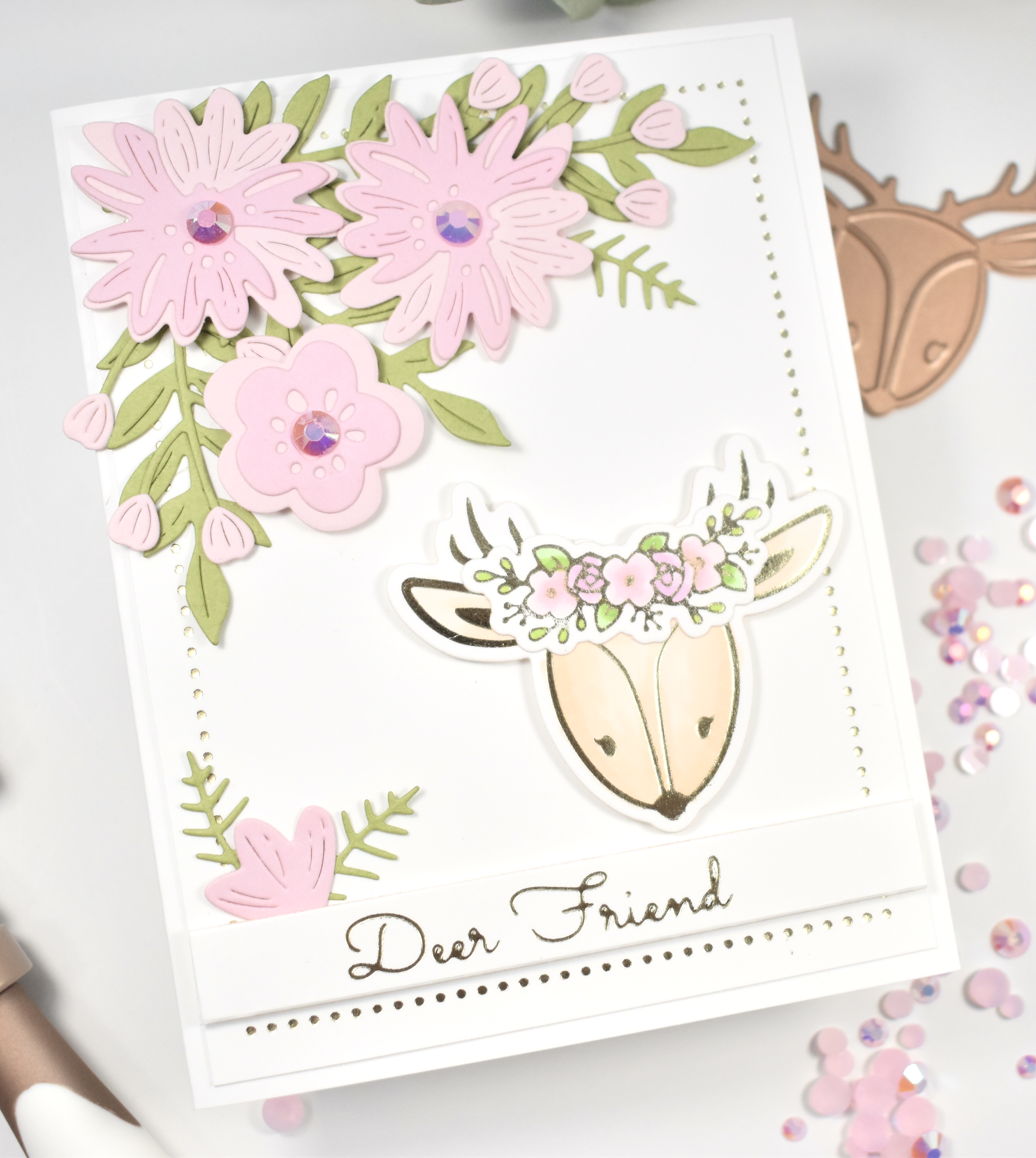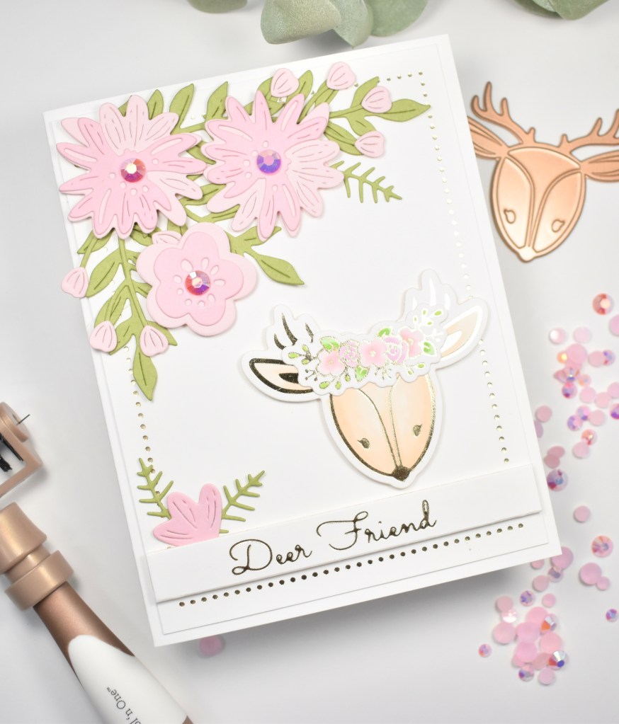 I used Copic Markers E000, E00, YG11, YG13, RV00 and RV10 to color the deer and florals, and used the coordinating dies in the set to cut them out. I also used the Simply Perfect Layered Blooms Set to cut some florals and leaves from pinks and green cardstock. I went ahead and adhered the floral pieces together using Craft Tacky Glue.