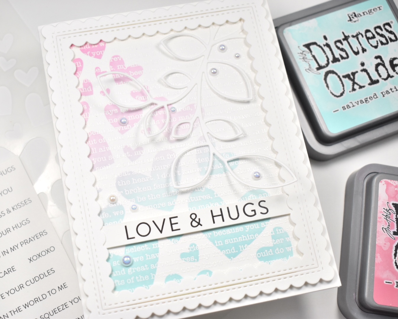 To begin this project, I stamped the SSS Friendship Text Background on a panel of Neenah Classic Crest 110lb cardstock using VersaMark Ink and heat embossed it using SSS Detail White Embossing Powder. I then affixed the Fading Hearts Stencil to the panel using masking tape, and ink blended the hearts using Distress Oxide Salvaged Patina and Picked Raspberry inks.