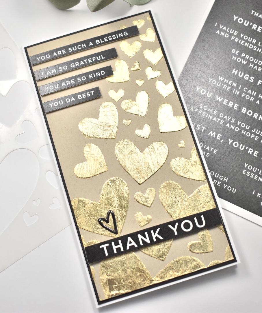 Once my panel was ready, I used Tonic Studios Nuvo Gold Gilding Flakes on the hearts. I just put some flakes on and rubbed them around with my finger until all of the hearts were covered, beautiful and shiny! I decided on some SSS Sentiment Strips to adorn this card, so I trimmed those down and adhered them to my panel using 3M Foam Tape. I also found a cute, black heart in my sticker stash to add as well.