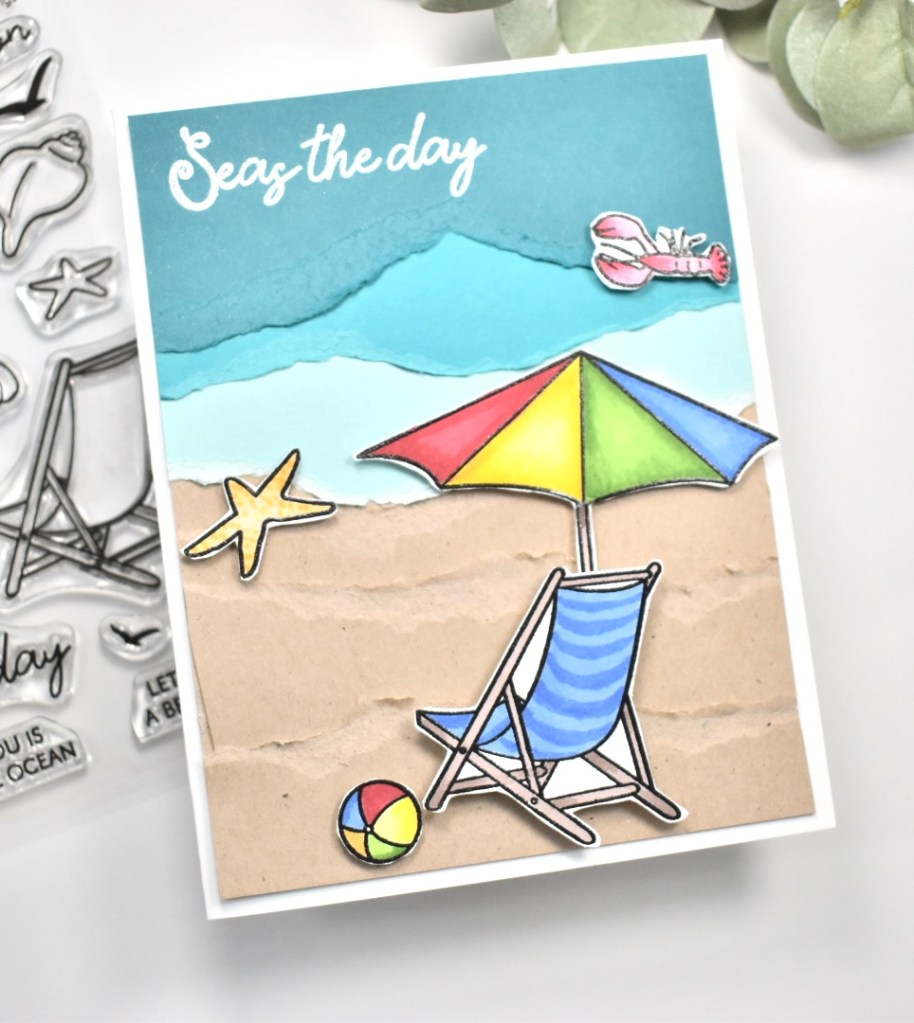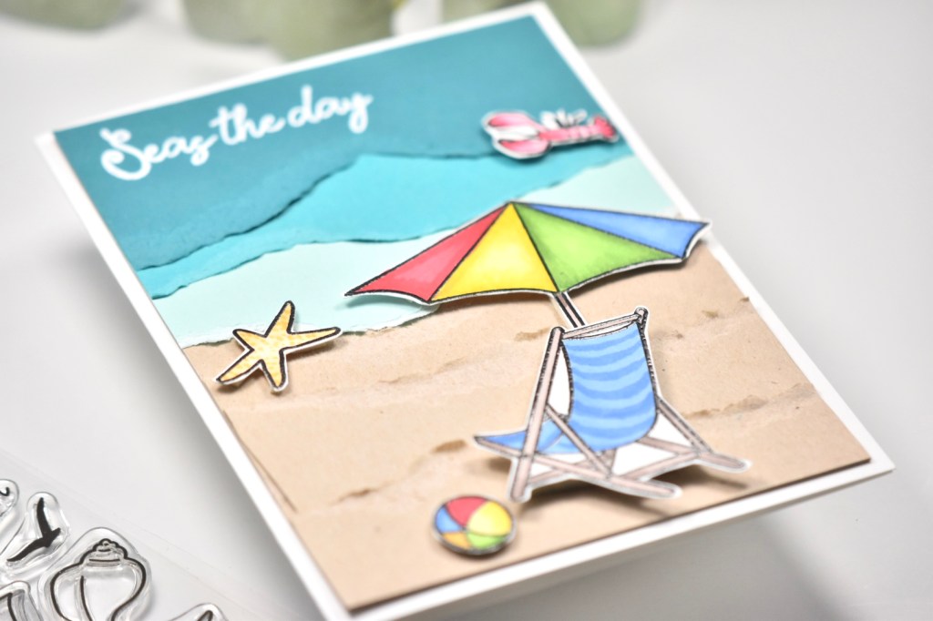 As soon as I saw this set, I knew that I wanted a torn edge background to mimic the water and sand, so that’s exactly what I did! But before all of that, I needed to get my beach elements ready. I went ahead and stamped the chair, umbrella, ball, lobster and starfish using VersaFine Onyx Black Ink and heat embossed those using Ranger Clear Embossing Powder. I colored them all with Copic Markers B23, B26, R37, R46, YG13, YG17, E71, E74, E79, Y08, Y11, Y15, YR000, YR01, YR21, YR23, YR24, RV10, RV11, and RV29. Once all the coloring was finished, I fussy cut all of them out.