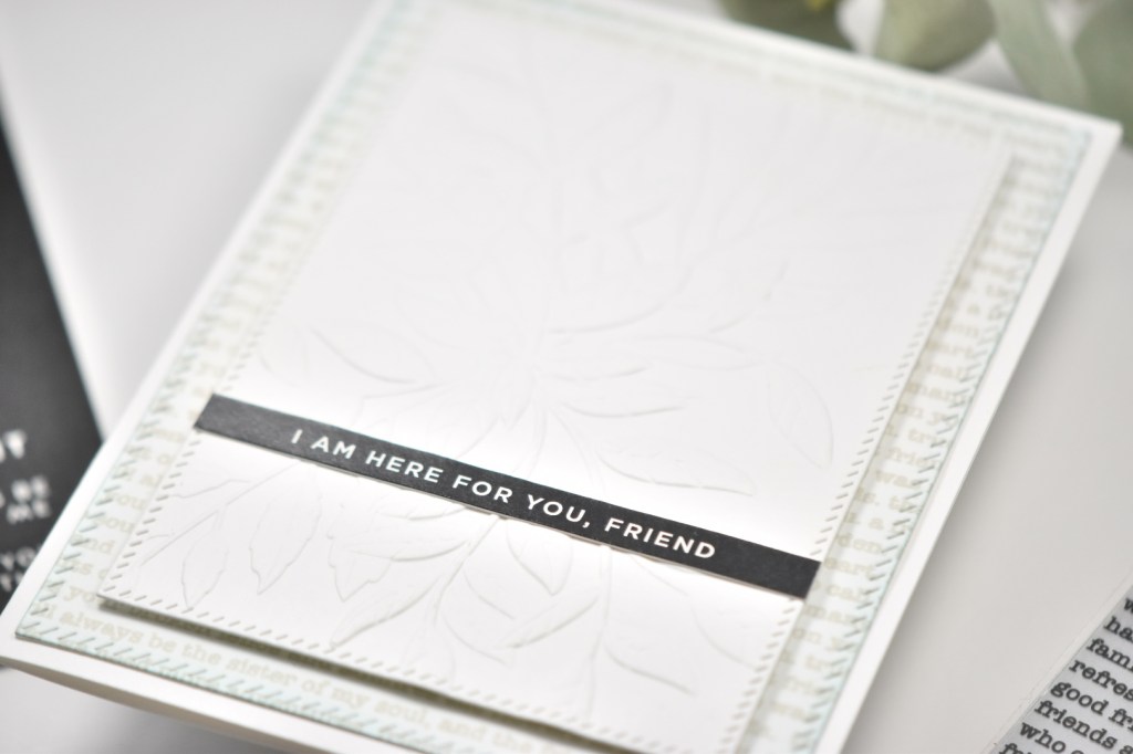 I adhered my embossed panel to the text panel using 3M Foam Tape, and adhered those to my card base, which is also Neenah 110lb. I found a SSS Reverse Sympathy Sentiment Strip, and glued that directly to the embossed panel using Craft Tacky Glue.
