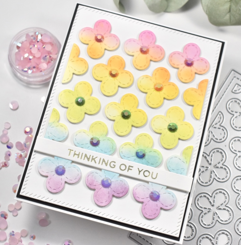 I chose a Thinking of You sentiment, which is from the Spellbinders Everyday Sentiments II, and hot foiled it using Champagne foil and glued that to my panel using Craft Tacky Glue. I attached that panel to a black cardstock panel using 3M Foam Tape for added dimension, and then adhered that to my card base, which is also Neenah 110lb. To finish up this card, I used PinkFresh Studio Jewel Mix to add a bunch of bling in rainbow colors as well.