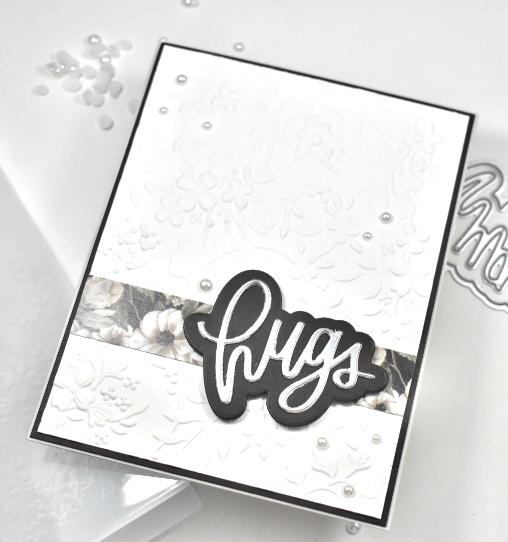 I chose a piece of patterned paper from the Paper Rose Forever set that’s included in the kit, trimmed a strip that measures 3/4” and glued it to my embossed panel using Craft Tacky Glue. I then cut the included Big Scripty Hugs sentiment once from Neenah 110lb, once from SSS Holographic cardstock, and I cut the shadow twice from black cardstock, adhering all of those together using the same glue.