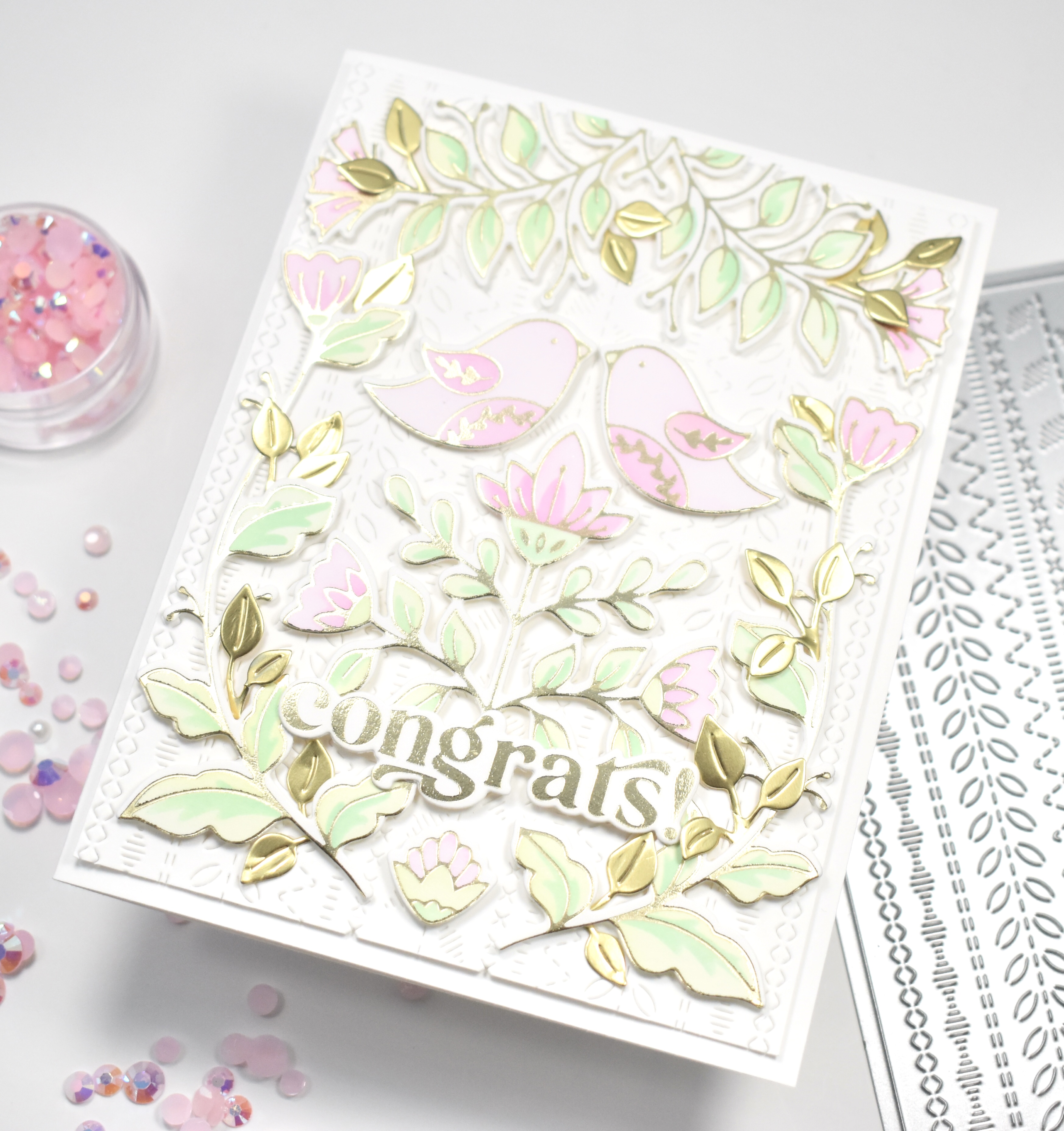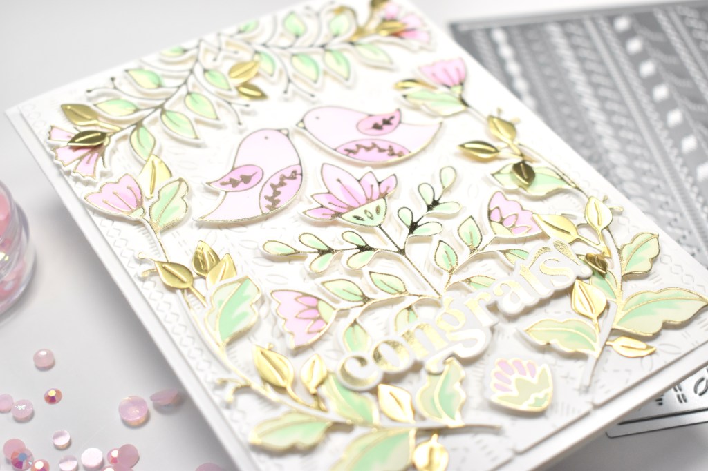 I foiled the PFS Perfect Sentiments Foil Plate using the same Champagne foil and cut those out using the coordinating die. I cut the sentiments two more times from Neenah 110lb so that I could glue those to the corresponding sentiments for dimension. I chose the Congrats sentiment from this set, because this card kinda seems wedding-ish, and glued that directly atop the Folk Art Bird pieces.