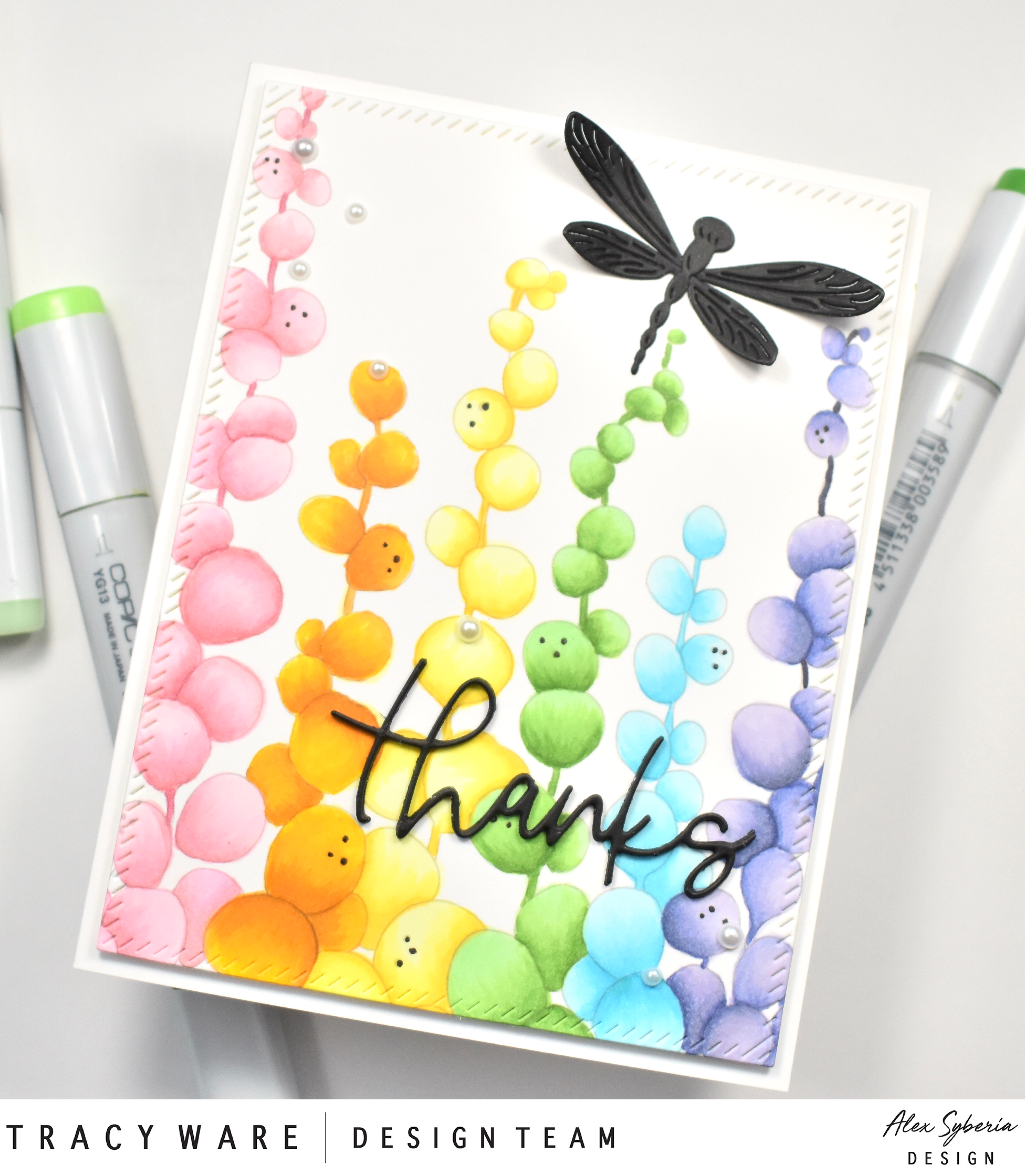 I also used a Copic Multiliner 0.3 to add back the black dots on the “berries” as they got lost during the coloring process. I opted for a Thanks sentiment using the Concord and 9th Scripted Thanks die cut. I cut it three times from black cardstock and adhered those together using liquid glue. I also cut the SSS Etched Dragonfly from black cardstock.