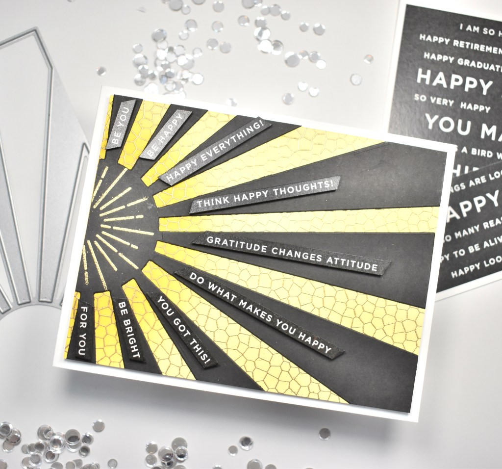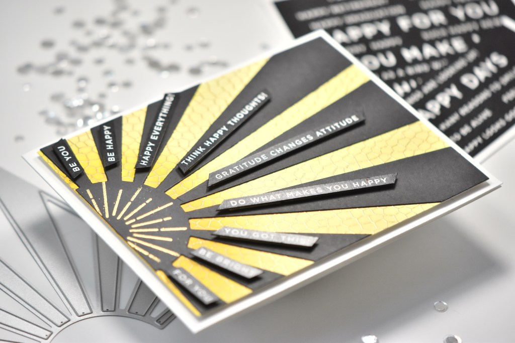 I rifled through all of my SSS Reverse Sentiment Strips to find ones that I liked and that would fit on the black rays of the sun. Once I had enough trimmed, I used a black Copic marker to black the edges of the sentiment strips and adhered them using foam tape.