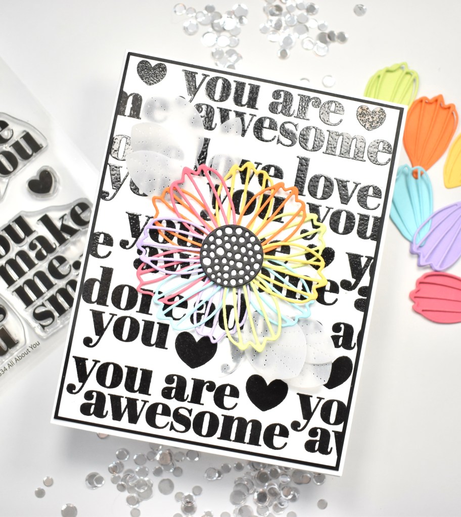 Once all of the sentiments were stamped, I filled in the gaps with the hearts that are included in this set. Next, I pulled out the SSS Cosmo Flower Petals die and cut the detailed petals from various colored cardstock. I believe most of the colored cardstock is from The Stamp Market, but not 100% sure. I ended up cutting enough petals to make two flowers. I cut the detailed center from black cardstock twice and the solid center from white cardstock twice. I adhered the centers together using liquid glue, and began gluing the flower petals to the back of that for each flower separately. So when I was done, I had two completed flowers.