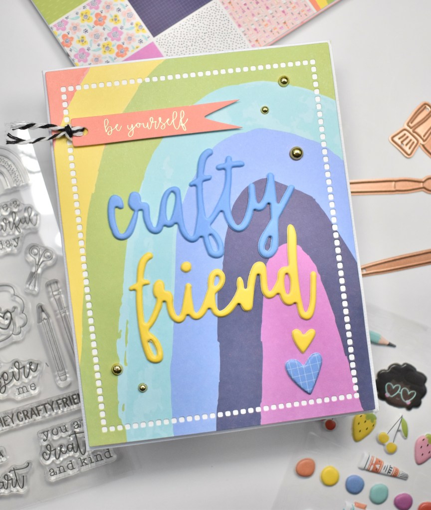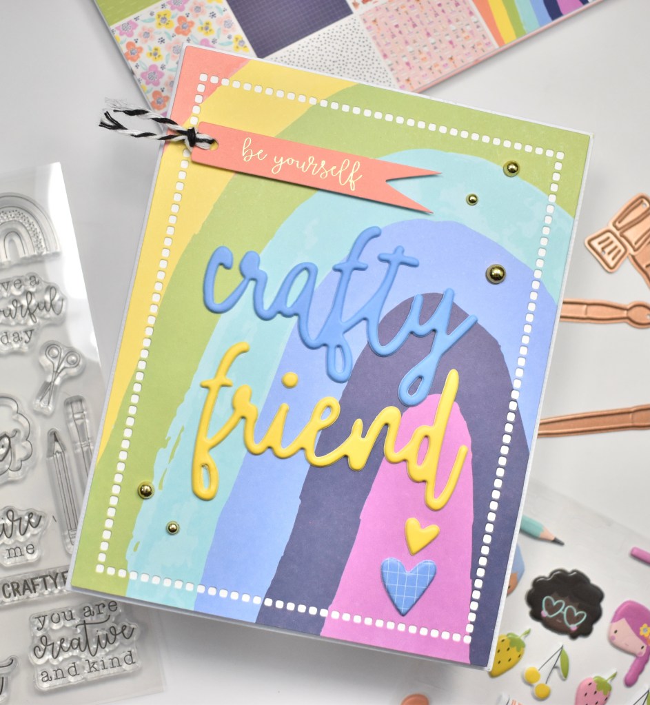 I created five cards using this month’s kit, and there’s so much left to create with! For my first card, Crafty Friend, I used the Spellbinders Hemstitch Rectangles die to trim a piece of rainbow patterned paper and mounted that atop a panel of Neenah Classic Crest 80lb cardstock for more stability. I added some black and white twine to one of the ephemera flags, which says, “be yourself,” and adhered that to the top left corner of the panel using foam tape.