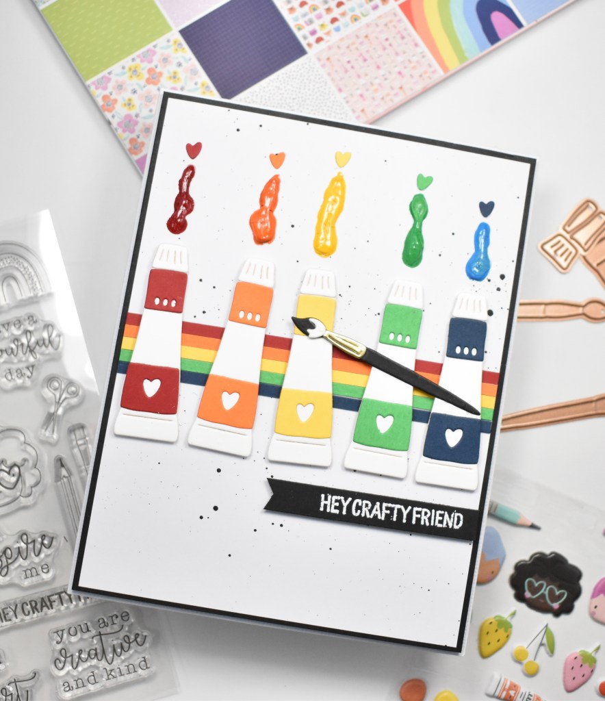 For the fifth and final card, I used the included die cuts along with the included cardstock to cut the paint tubes and paint brush. I cut strips of the colored cardstock and adhered those to a black splattered panel. I assembled the paint tubes and paint brush using liquid glue and adhered them to the panel using foam tape.