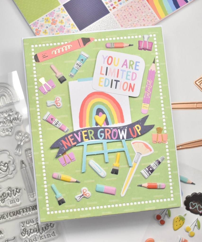 I positioned all of the art related stickers around the focal point, adding in some other art related ephemera that I had to adhere using glue. The panel was then adhered to the card base with foam tape.