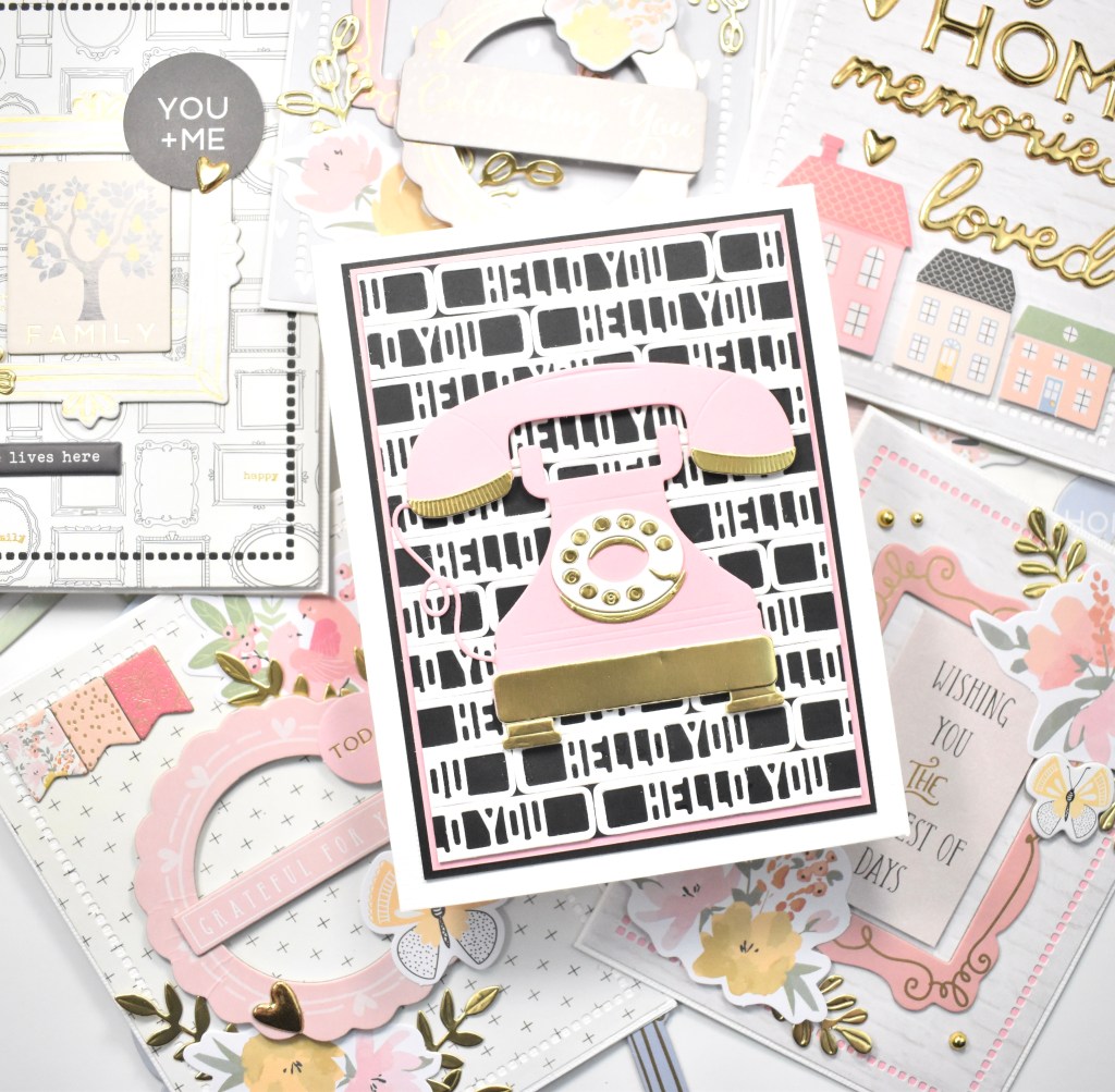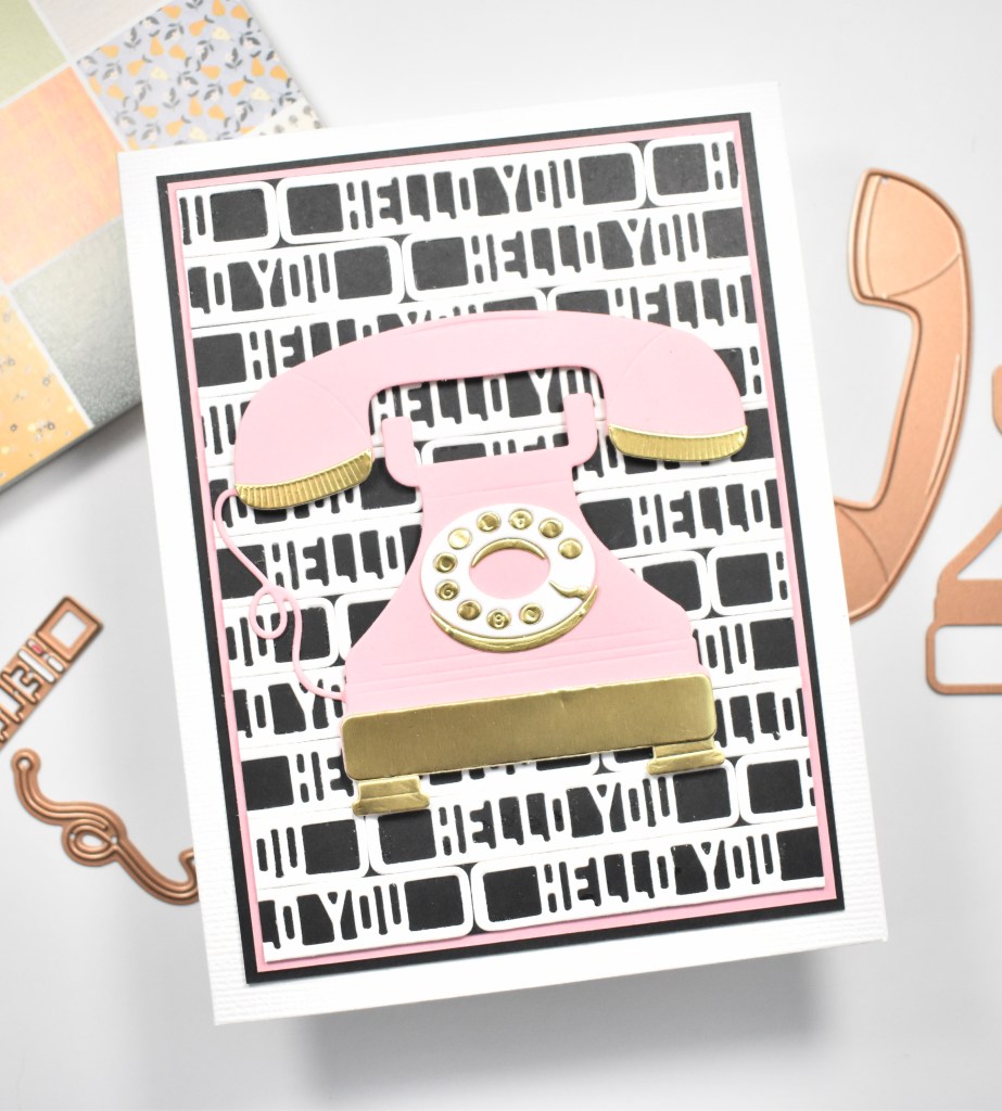 I then began die cutting the telephone pieces from pink and mirror gold cardstock, which is also included in this kit. I assembled the phone using glue and placed foam tape on the back of it. That was then adhered to the Hello You panel. That panel was glued to a panel of the same pink cardstock and then to a panel of black cardstock. Everything was then adhered to a card base, which is included in the kit, as well.