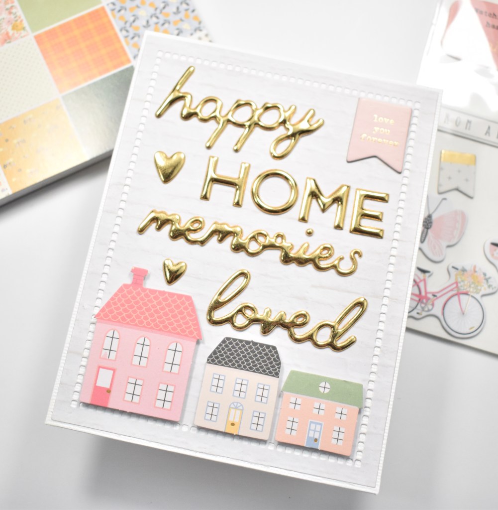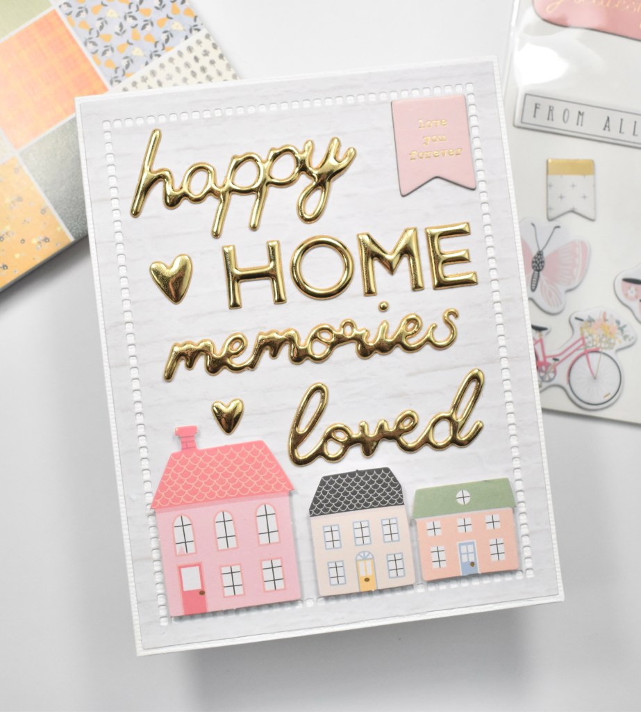 My fourth card, Happy Home, uses some ephemera, chipboard stickers and these gorgeous gold stickers! I did use the Hemstitch Rectangles again for that added interest. I did adhere all of the houses with foam tape for a bit of dimension.