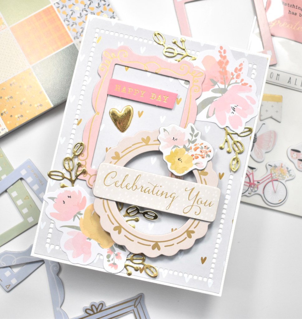 The fifth card, Wishing You the Happiest of Days, uses those awesome Hemstitch Rectangles again, along with some leaves from the Spellbinders Mini Blooms and Sprigs die set. Such a great set for sure! I glued the gold leaves under the ephemera pieces and used glue and foam tape on everything else. I did mount my panel on some included pink cardstock for added interest.