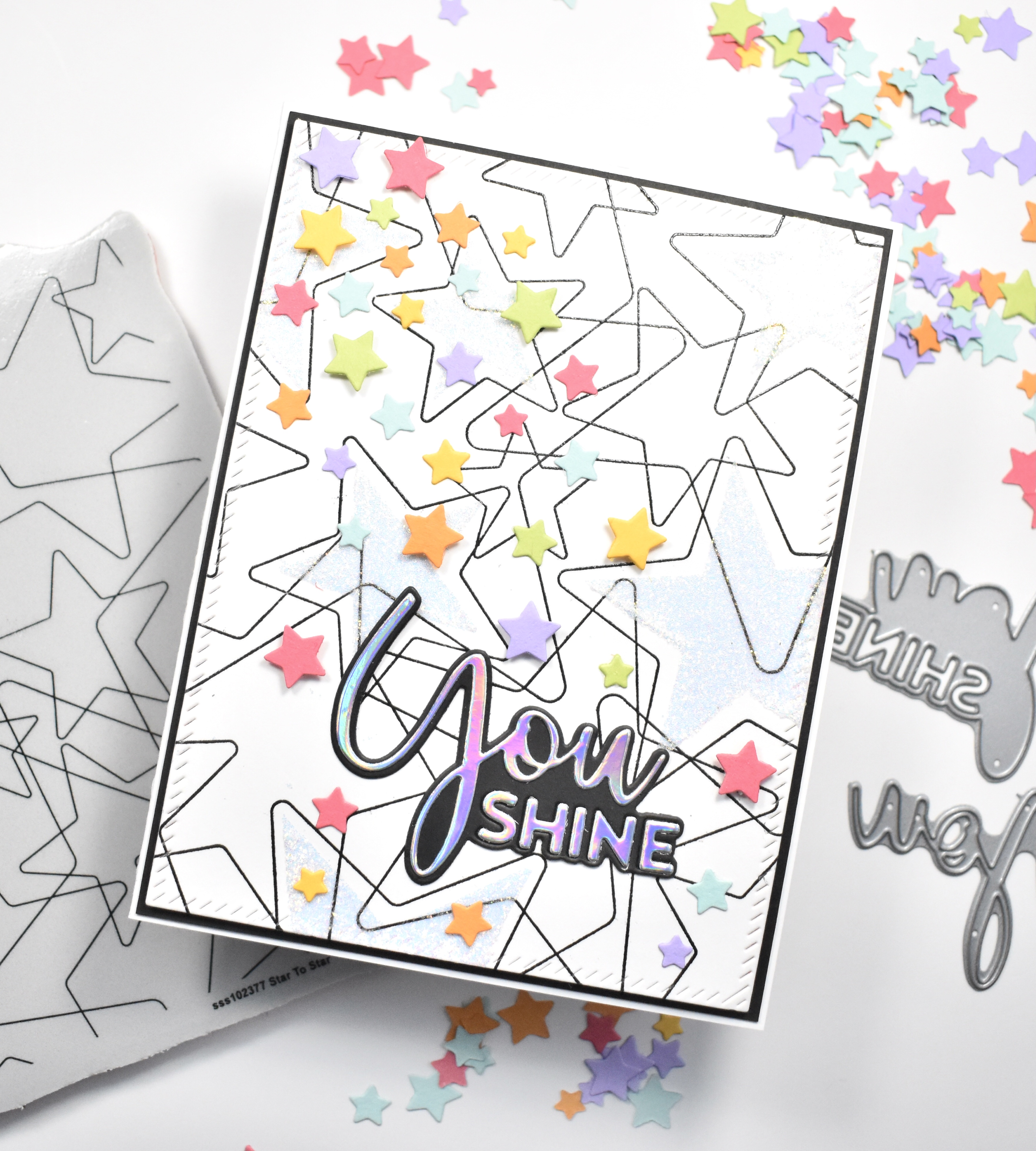 I used the SSS Mini Stars Party Die to cut stars from various rainbow cardstocks from my stash. While I was die cutting, I went ahead and cut the SSS You Shine Die once from black cardstock and once from SSS Holographic cardstock, adhering those together with liquid glue.