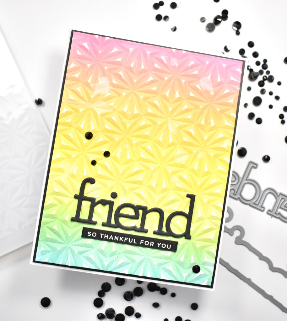 I began by trimming an A2 panel of Neenah Classic Crest 110lb cardstock and did some ink blending using Distress Oxide, Picked Raspberry, Spiced Marmalade, Mustard Seed, Twisted Citron and Broken China. This is my favorite rainbow color combo! Once the ink blending was done, I ran the panel through in the SSS Magnetic Embossing Folder.