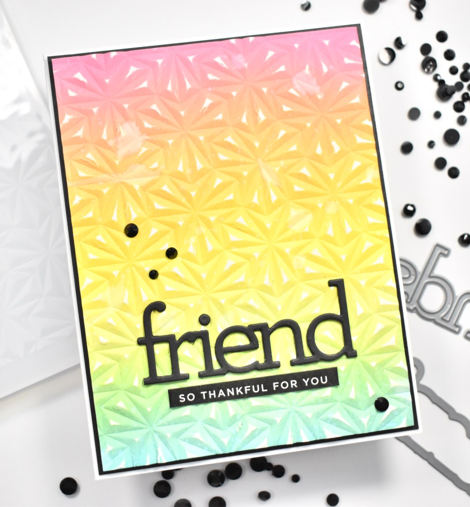 I die cut the SSS Friends Die three times from black cardstock and adhered those together using liquid glue. I did trim off the “s” from Friends to suit my purposes. I also rummaged through my SSS Sentiment Strips to find an appropriate sub-sentiment for this card. Both of the sentiment were glued directly to the panel.