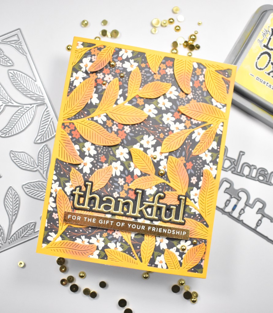 I first die cut the SSS Laurel Leaves Background Plate from Sunshine cardstock and did a little bit of ink blending using Distress Oxide inks in Mustard Seed, Spiced Marmalade and Walnut Stain. I just wanted to give the leaves a little bit of color and depth.