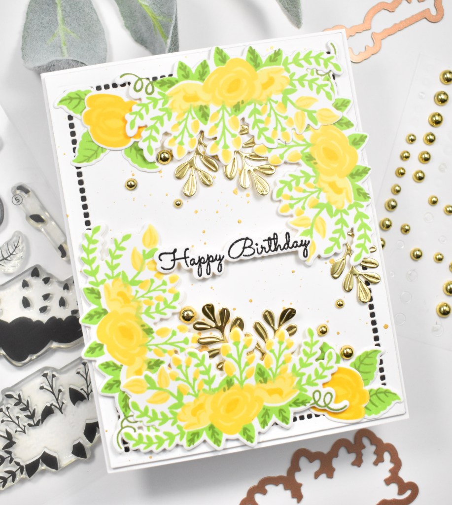 I began by stamping the florals on a panel of Neenah Classic Crest 110lb cardstock using PinkFresh Studio inks in Grassy Knoll, Olive, Lemon Whip, Sweet Mustard and Marigold. Once the stamping was done, I used the coordinating die, which is included in the set, to trim them out.