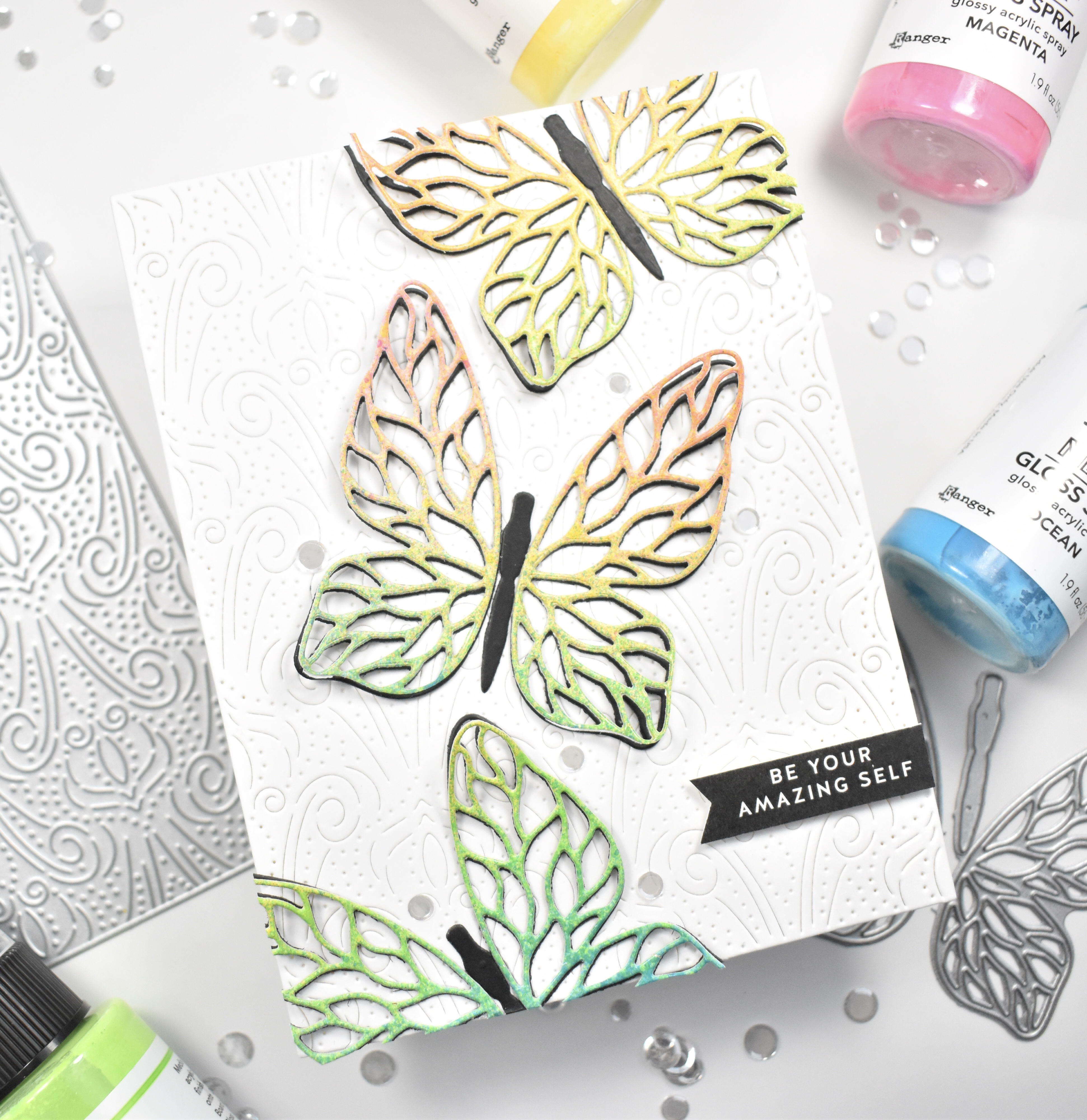 I used the new SSS Imperia Plate to create the background for the butterflies using Neenah 110lb, and I die cut the SSS Stylized Butterfly from my sprayed panel three times, because I wanted some movement across the card. I also cut the butterfly three times from black cardstock, and adhered those together using liquid glue.