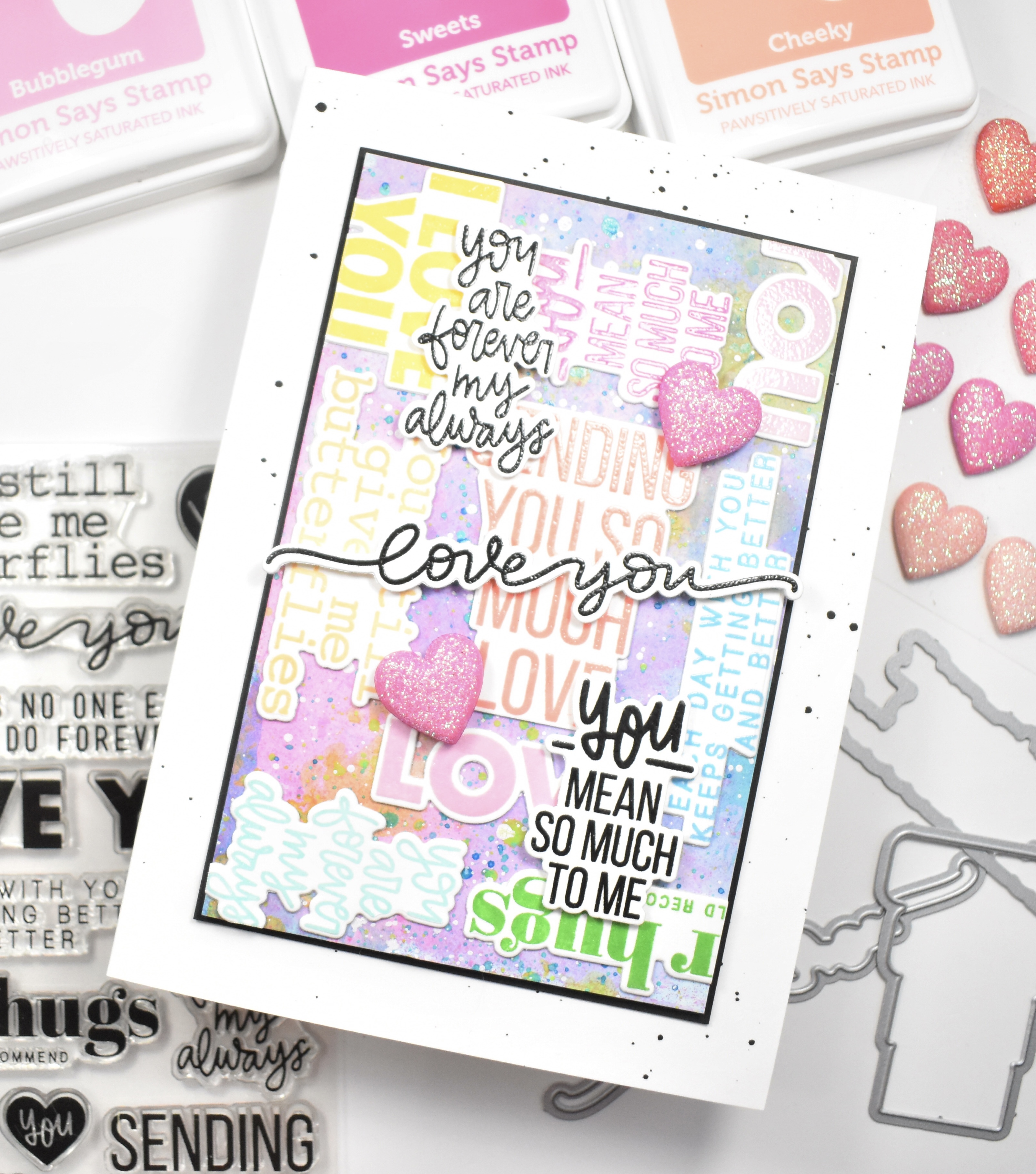 I adhered those three sentiments to the panel using foam tape for added dimension. I also added some pink glitter hearts, because why not, and because I felt like it needed something extra! This panel was then adhered to a black panel using foam tape, before being adhered to my card base with SSS Tape Runner, which I splattered with Royal Talens Amsterdam Oxide Black Acrylic Ink.