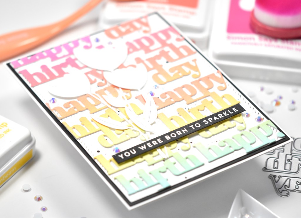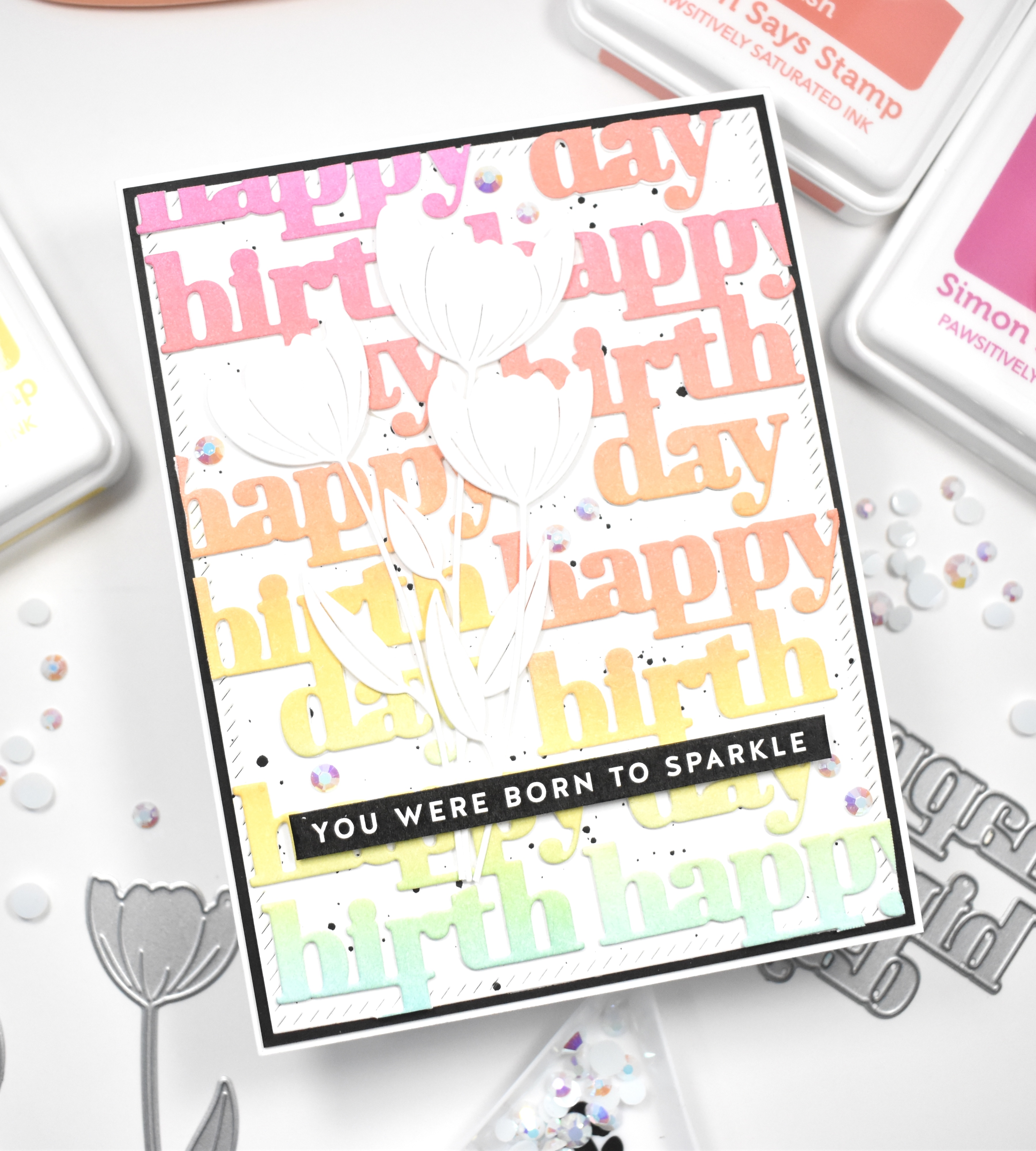 I’ve really enjoyed making backgrounds with sentiments lately, so I decided to hop on that bandwagon again for this one! It’s such a great way to stretch those sentiment dies, or even just stand alone dies! Anyhoo, I began this project by ink blending a large panel of Neenah Classic Crest 110lb cardstock using SSS Pawsitively Saturated Inks in Sweets, Blush, Sunshine and Surf. Once that was done, I die cut enough sentiments to cover an A2 card panel. I also cut them a second time for stacking purposes, and adhered them together using liquid glue.