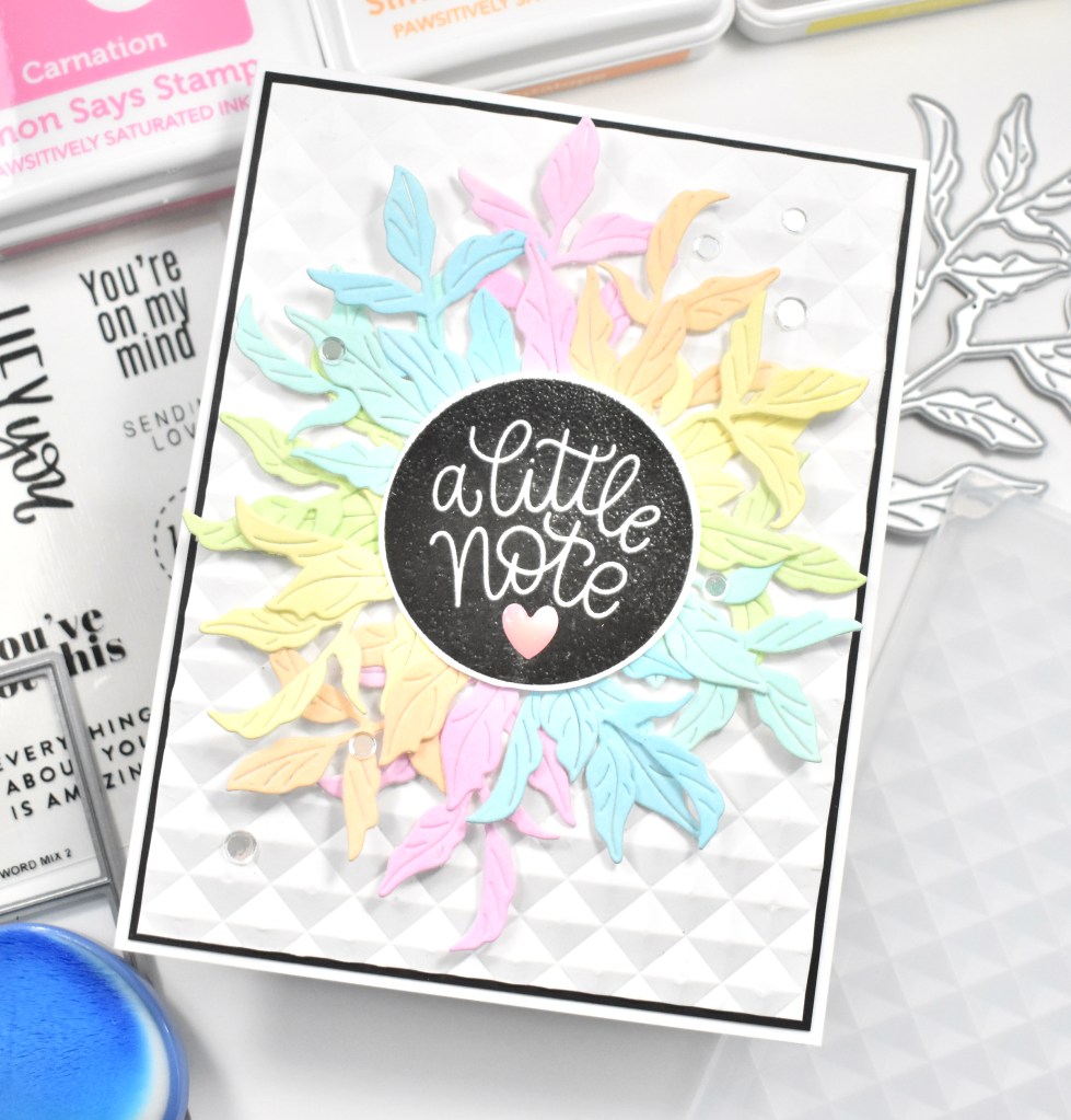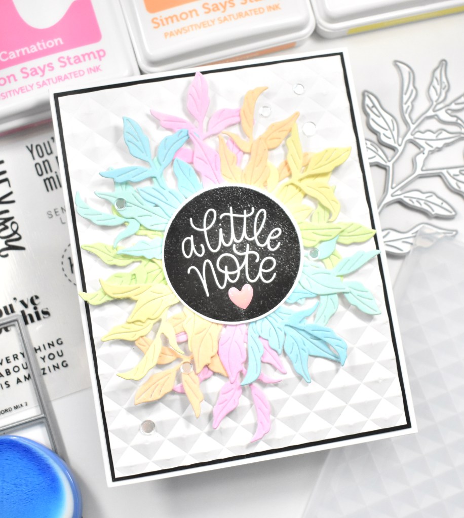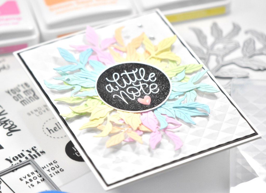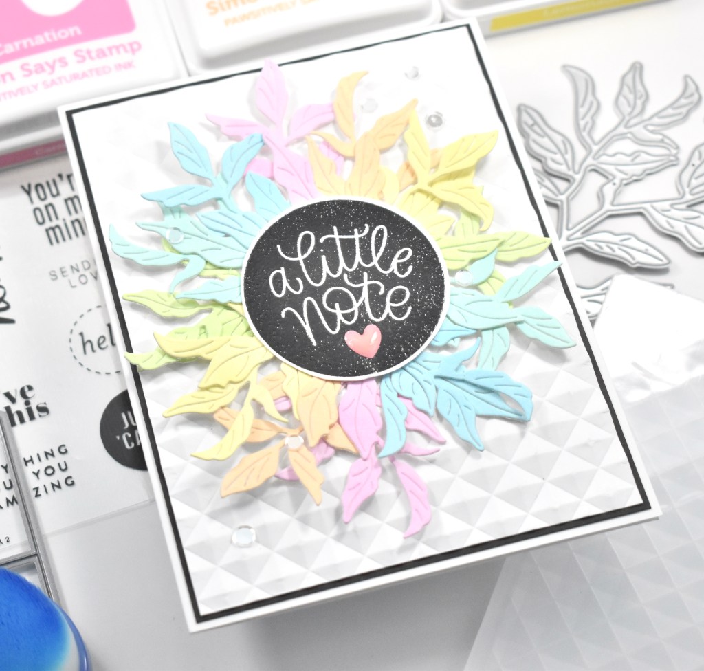 To assemble the card, I held the sentiment atop the embossed panel while placing the leaves in rainbow order around it, tucking the ends underneath.  I secured the leaves using liquid glue, and adhered the sentiment using foam tape.  I did trim the leaves down some so that there wasn’t so much bulk underneath the sentiment.  Once everything was secured, I added in some of the trimmed off leaves to fill in.