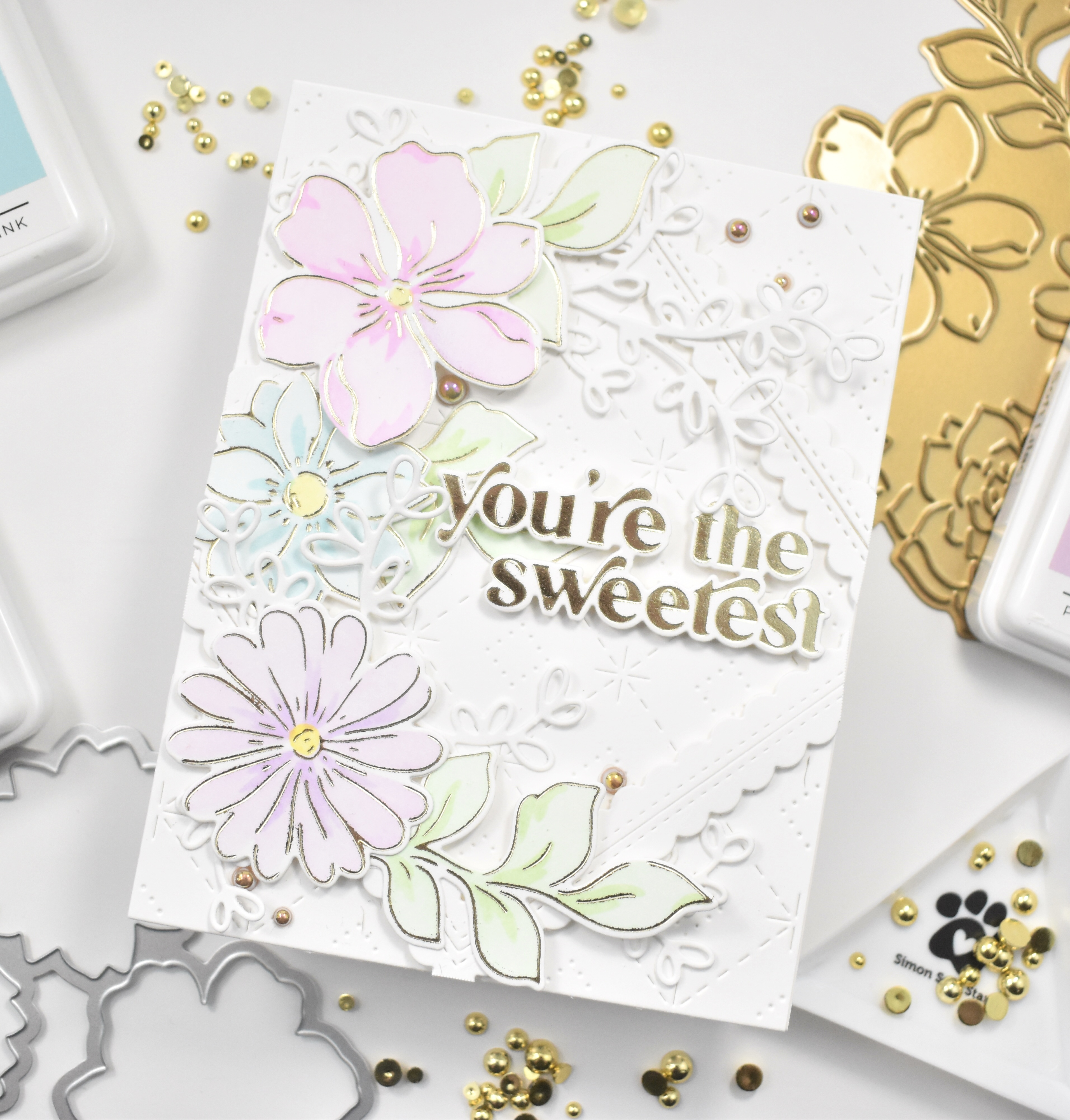 I ended up making two cards with the amount of flowers that I created, and I still had extras! So, I began by foiling the PFS Brighter Days Hot Foil Plate on a panel of Neenah Classic Crest 110lb cardstock, using Spellbinders Champagne hot foil. While the foil system is hot, I always like to go ahead and foil a few of whatever I happen to be working on.