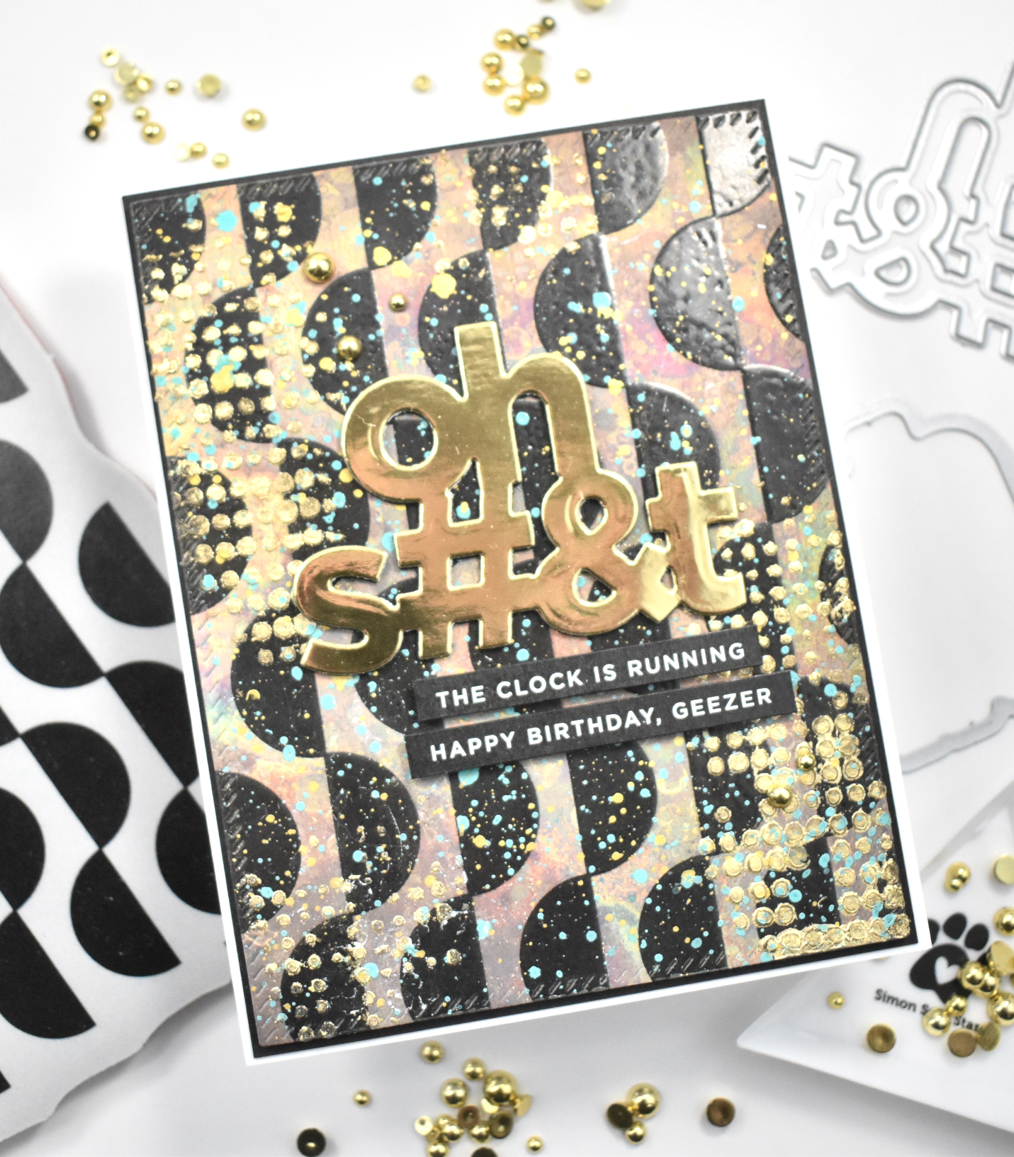 The next part is basically just a bunch of playing! I had no idea how it would turn out, but I just went for it anyhoo! I splattered the panel using Royal Talens Amsterdam Light Gold Acrylic Ink and Ranger Gloss Spray from Dina Wakely in Turquoise. I sat that aside to dry and worked on the sentiment, knowing that I was going to come back and add more to it. I trimmed the SSS Oh Expletive die once from polished gold cardstock and twice from black cardstock, adhering all of those together using liquid glue.