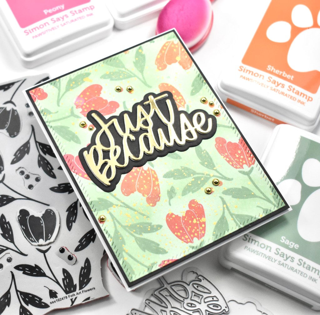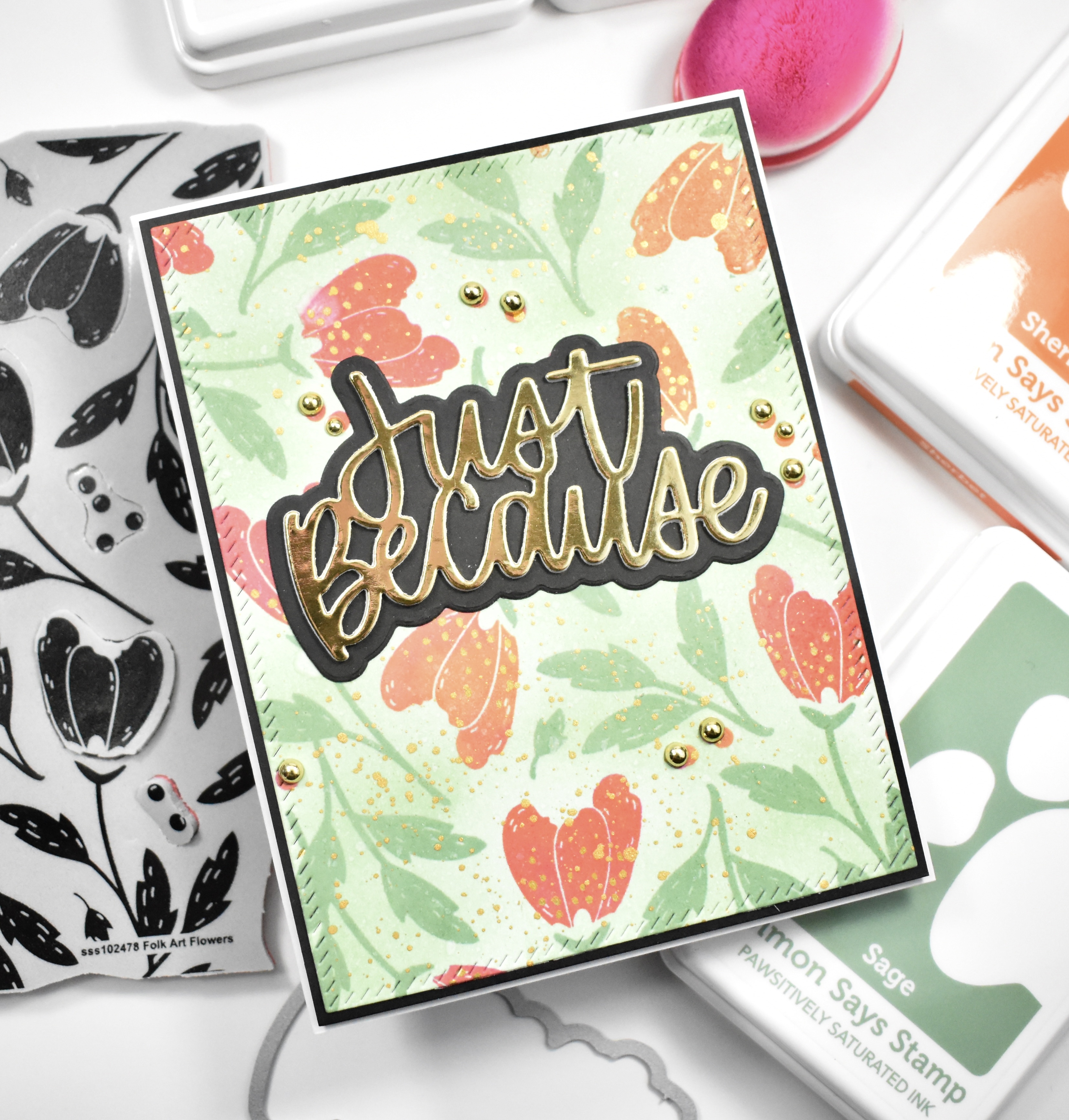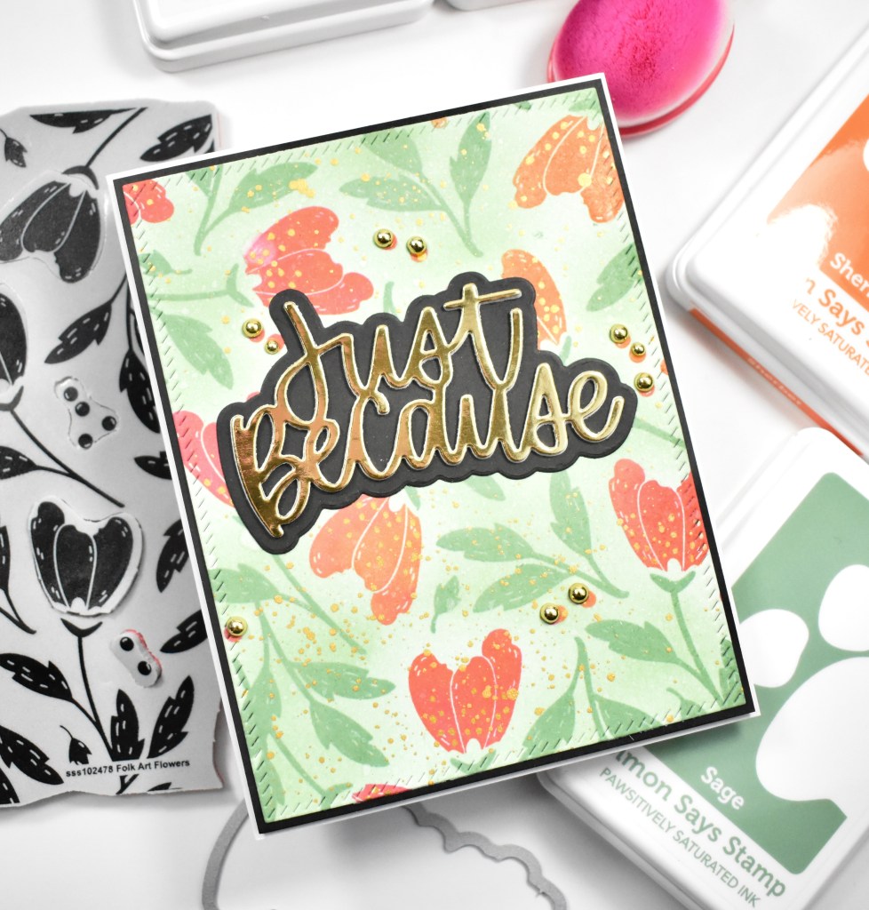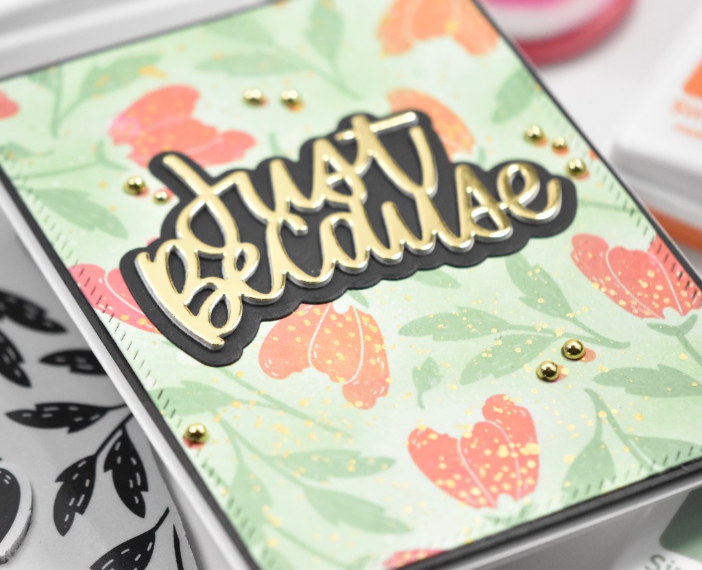 While that dried, I die cut the SSS Just Because sentiment once from polished gold cardstock, and twice from Neenah 110lb, adhering all of those together using liquid glue. I also die cut the shadow once from black cardstock as well. I glued the sentiment to the panel and added some PinkFresh Gold Metallic Pearls, because we all need bling!