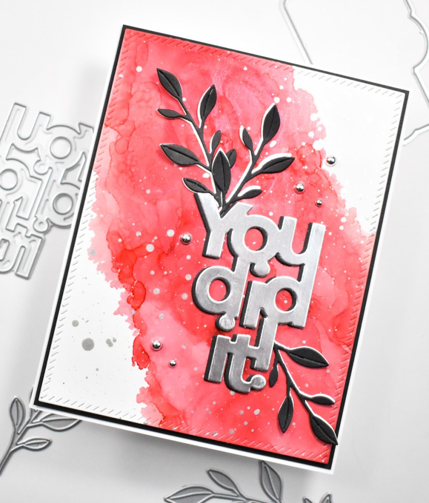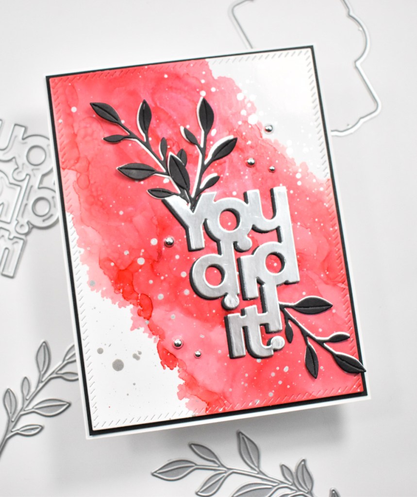 I die cut the SSS You Did It once from SSS Matte Silver cardstock and twice from black cardstock and adhered those together using liquid glue, but offsetting them just slightly to create a shadow effect. As I always say, every card seems to need leaves and this one was no exception. I used the SSS Etched Meadow Flower and Leaves to cut a few leaves from black cardstock, as well as Neenah Classic Crest 110lb cardstock.
