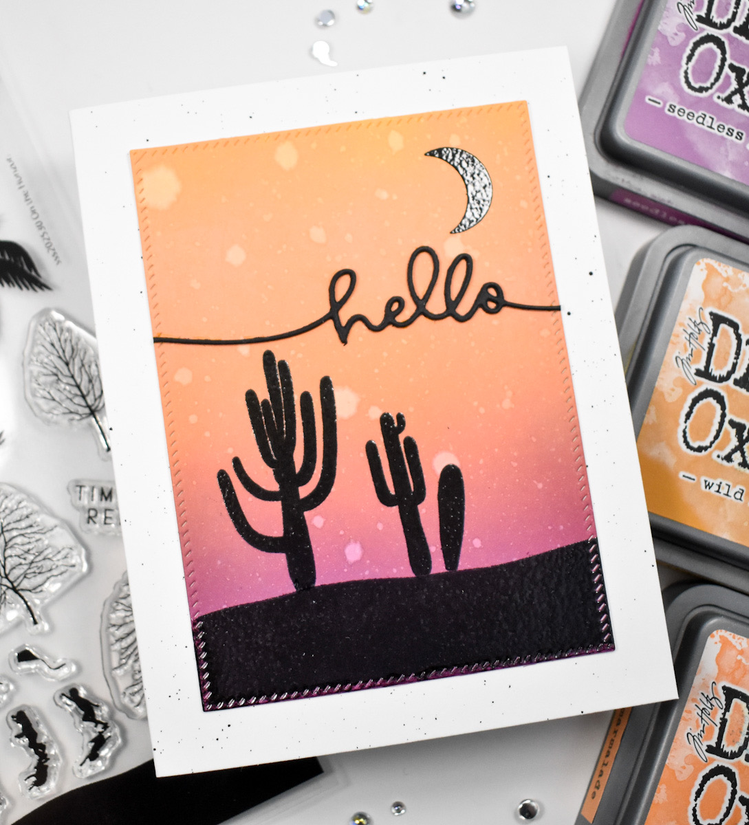 Once that was dry, I stamped some of the desert elements from the SSS On the Horizon set using VersaFine Onyx Black ink and heat set it using Ranger Clear Embossing Powder. I repeated that process twice to get a smoother finish on the embossing.
