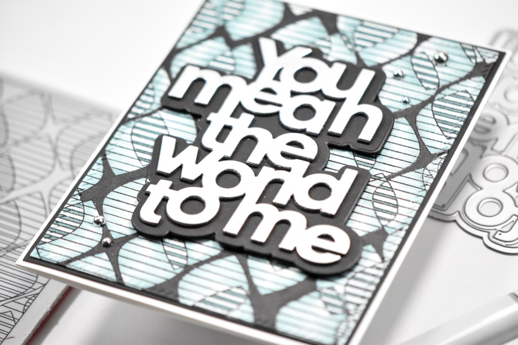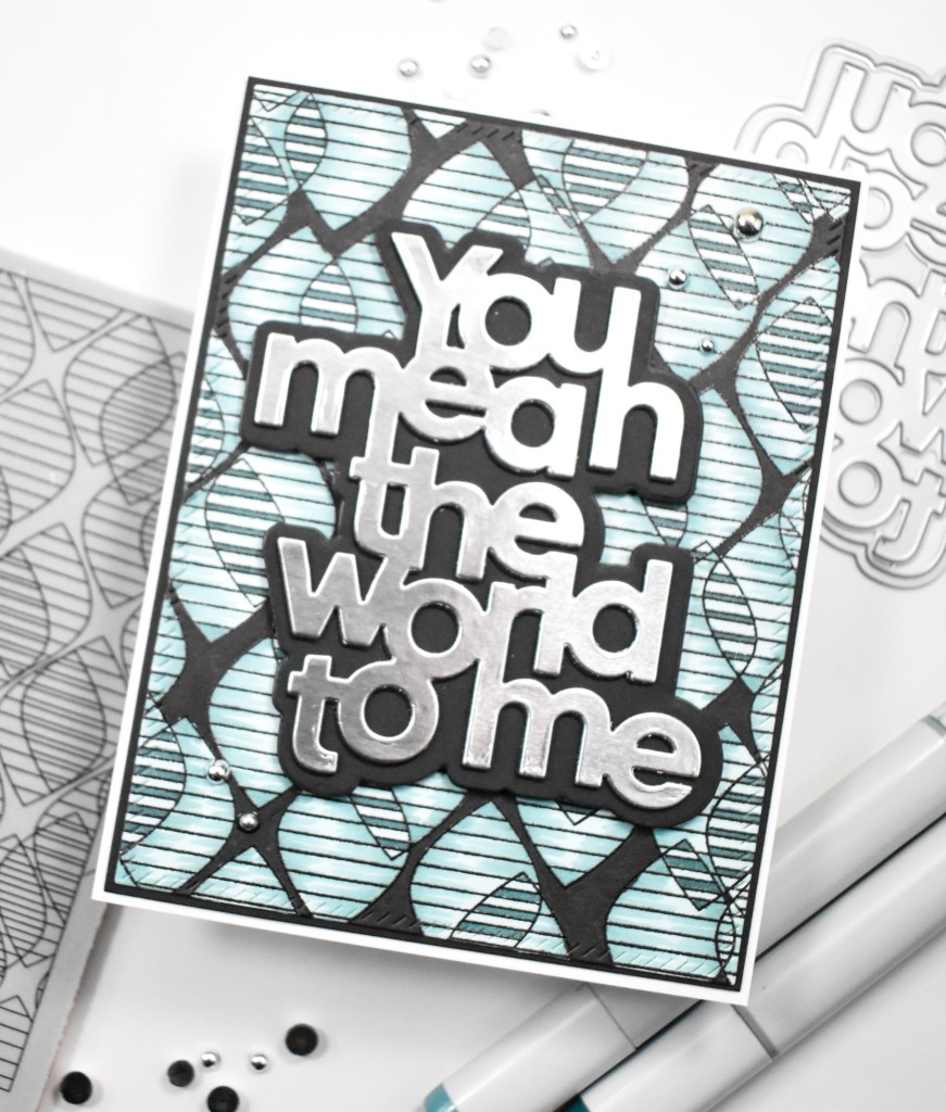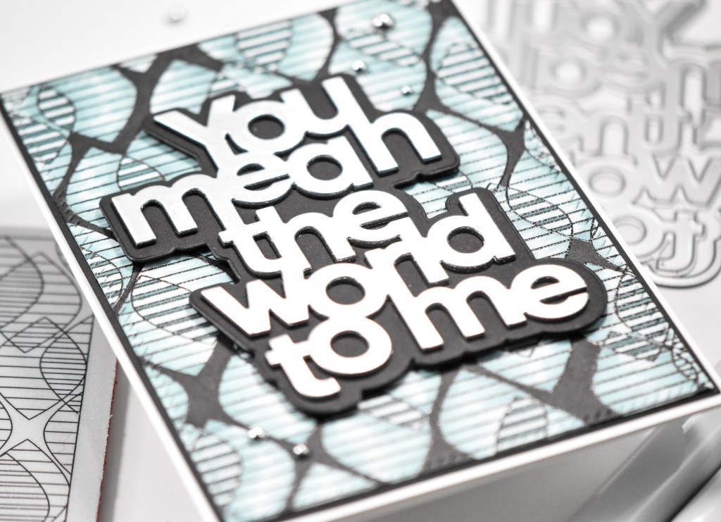 I used the SSS You Mean the World to Me die and cut that from SSS Matte Silver cardstock once and then cut it two additional times from black cardstock. I also cut the shadow die from black cardstock as well. I adhered all of those together using liquid glue.