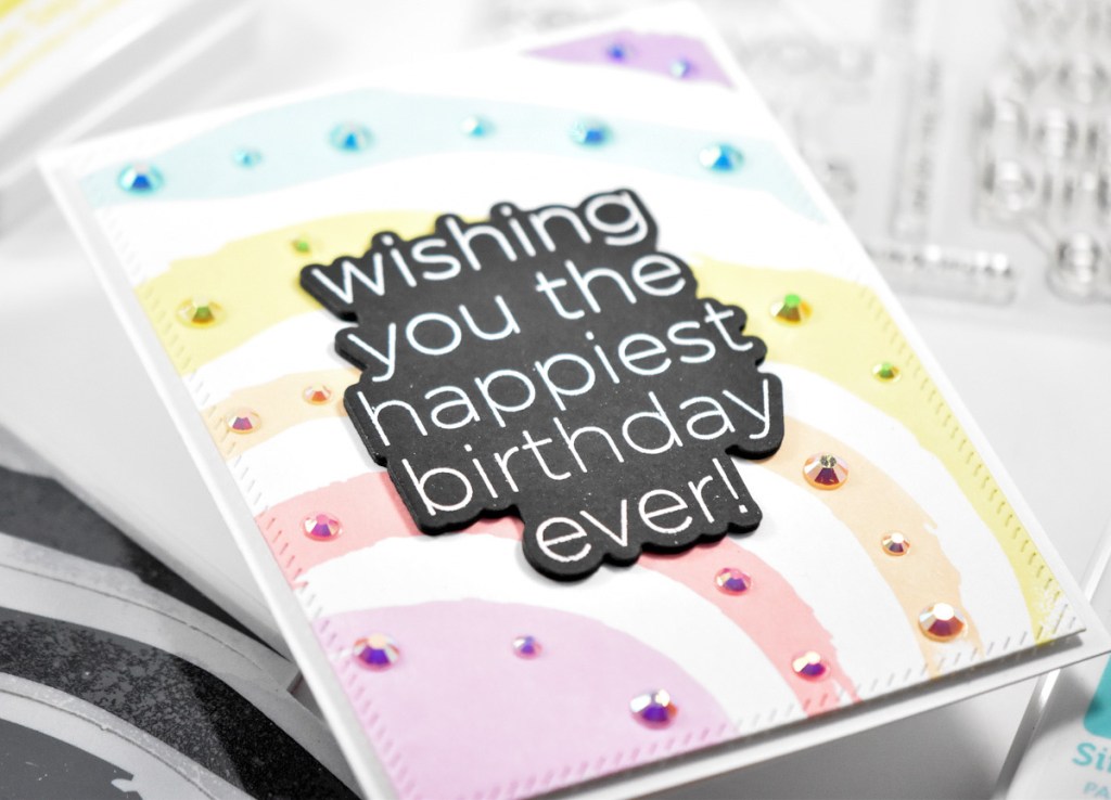 I stamped the birthday sentiment from the SSS Clean Line Stacks set onto black cardstock using VersaMark ink and heat set that using SSS Detail White Embossing Powder. I used the coordinating die to trim out the sentiment, cutting it an additional two more times and adhering all of those together using liquid glue.