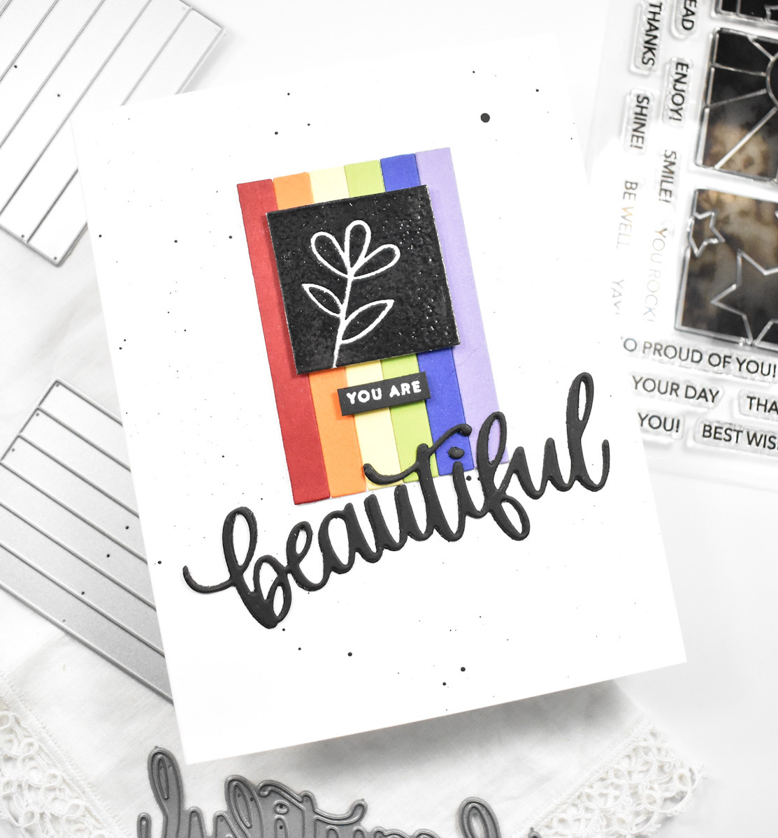 I used the SSS Beautiful die and cut that three times from black cardstock and glued all of those together. I stamped the “you are,” which is from the SSS Tiny Words stamp set, on black cardstock using VersaMark ink and heat embossed it using SSS Detail White Embossing Powder.