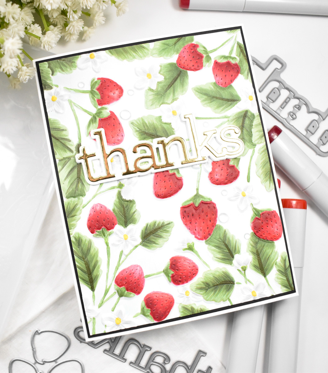Hello Friends and thanks so much for stopping by! I’m back today with a card featuring the new Strawberry Fields Embossing Folder from Simon Says Stamp’s latest release, Out of This World. I had a fun time working on this one, although it took me the better part of a day. That’s just me though, it takes me forever to color anything! Anyhoo, let’s roll through the details of this one.