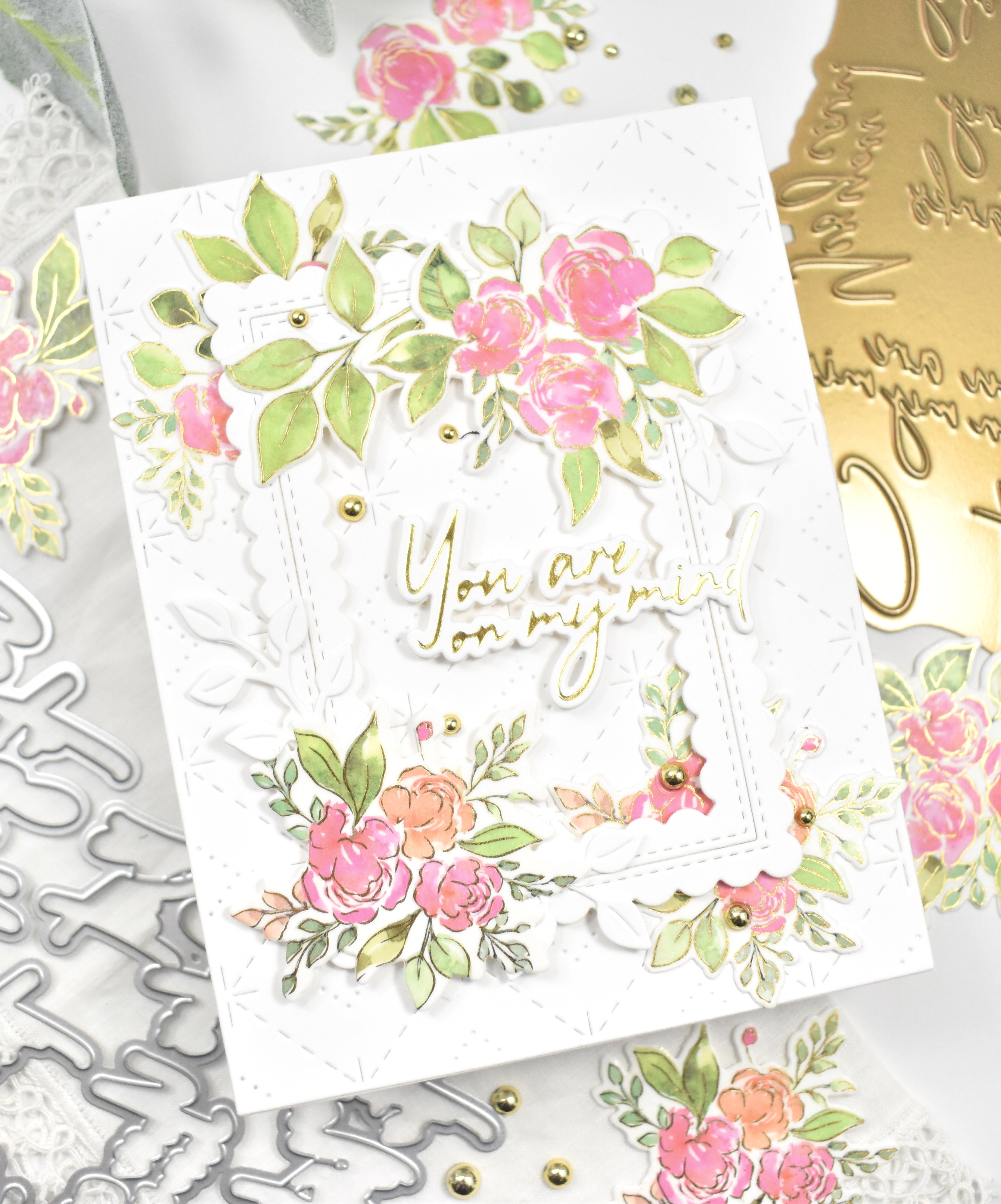 I also pulled out a scrap and used the PFS Stitched Scalloped Rectangles to cut one of the smaller rectangles from this set. I set all of these pieces aside while I worked on the sentiment, and for that I used the PFS Scripted Sentiments. I used gold hot foil to foil the sentiment and used the coordinating die to trim it out. I cut two additional sentiments and adhered those together to make it a bit more sturdy and to add more dimension.