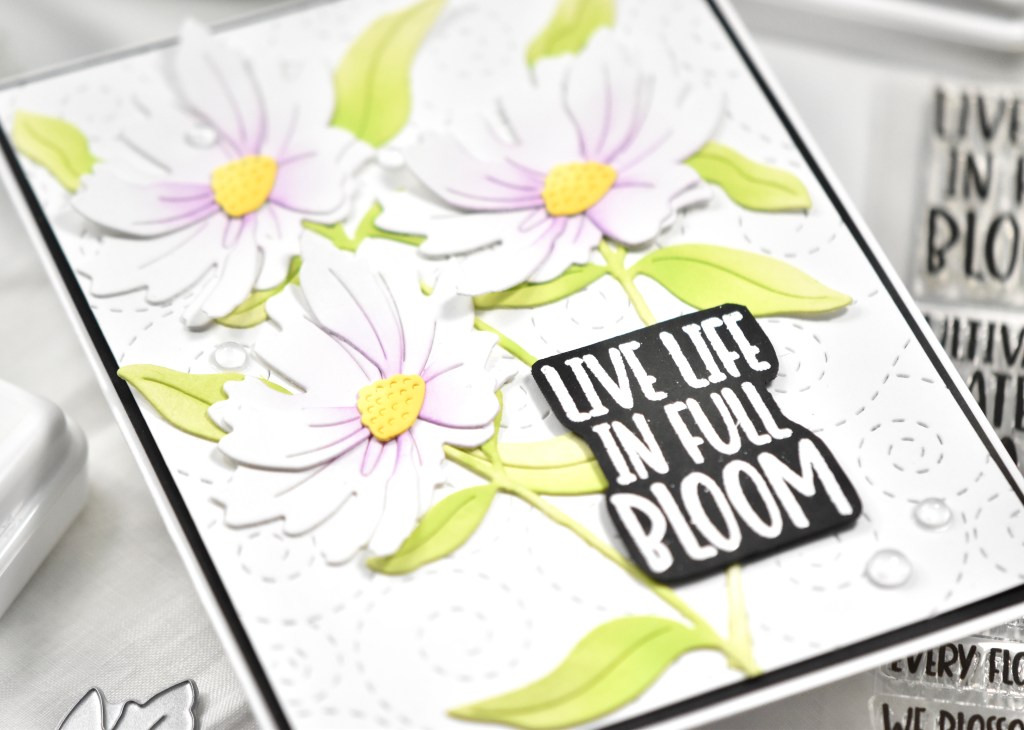 Once the flowers had some color, I cut a background using the SSS Stitched Whirl Background and set that aside while I worked on the sentiment. I selected a sentiment from the SSS Plant Sentiments set, and stamped that onto some black cardstock using VersaMark Ink. I then heat set it using SSS Detail White Embossing Powder and hand trimmed it out.