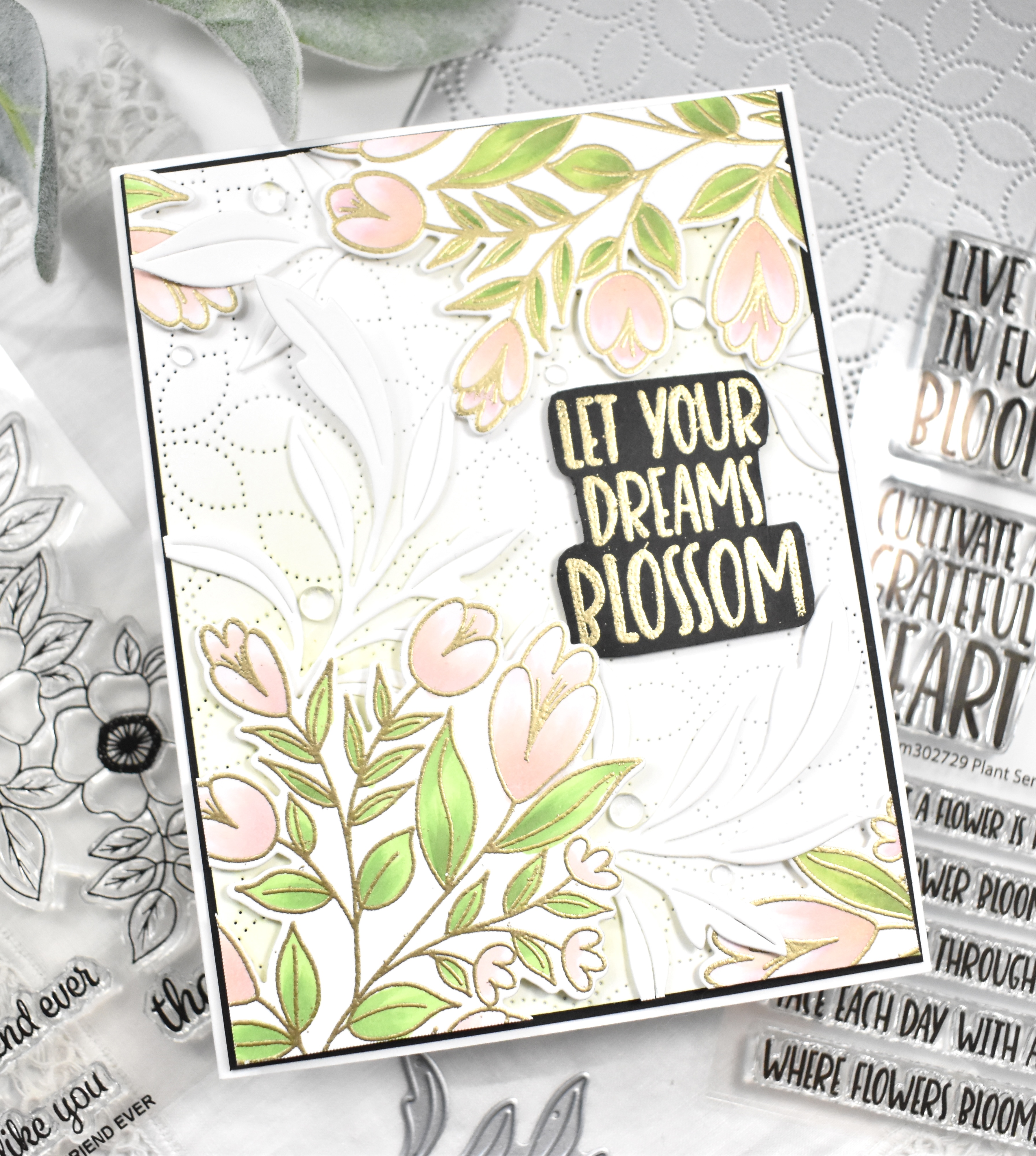 I used the Let Your Dream Blossom sentiment from the SSS Plant Sentiments set and stamped that on black cardstock using VersaMark Ink, and embossed that using the same gold embossing powder. Once that was done, I did end up fussy cutting the sentiment out. I used the SSS Detail Petal Plate to cut the background and did some very light ink blending on the corners using SSS Pawsitively Saturated Ink in Celery.