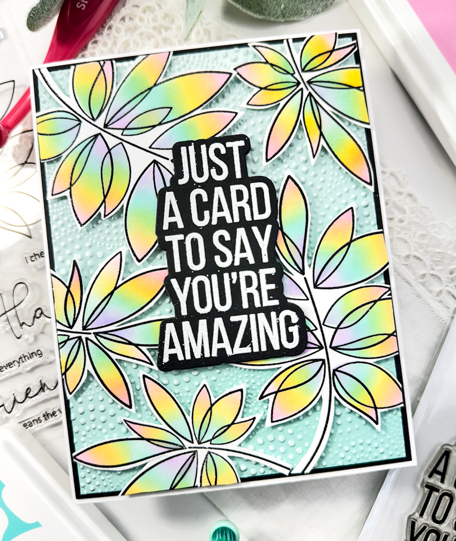 I began by stamping the leaf clusters on some Neenah 110lb cardstock using VersaFine Onyx Black ink, and heat setting them using Ranger Clear Embossing Powder. I then began the ink blending with the stencil using SSS Pawsitively Saturated Ink in Bubblegum, Lemonade, Seafoam and Lilac. Once the ink blending was complete, I fussy cut the leaves and set them aside while I figured out the rest of the card.