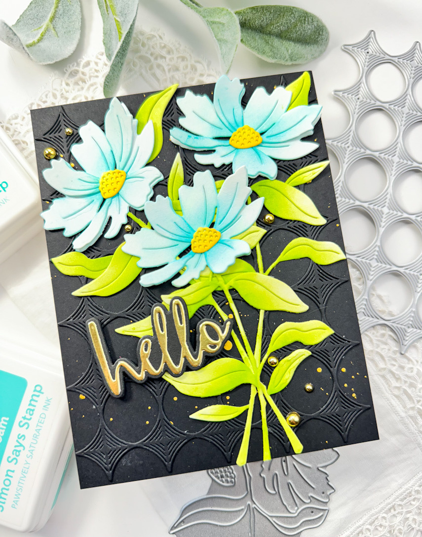 Before adhering the Whirl Diamond die cut to another panel of black cardstock, I splattered the panel with some gold acrylic ink for just a touch of added interest. Once that was dry, I adhered the die cut panel using liquid glue. I determined the placement of the florals, trimmed off a few leaves as necessary, and adhered the stems and flowers to the panel.