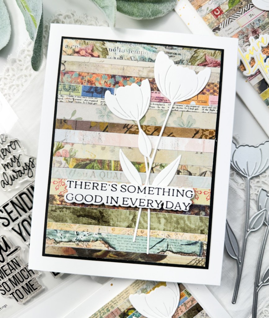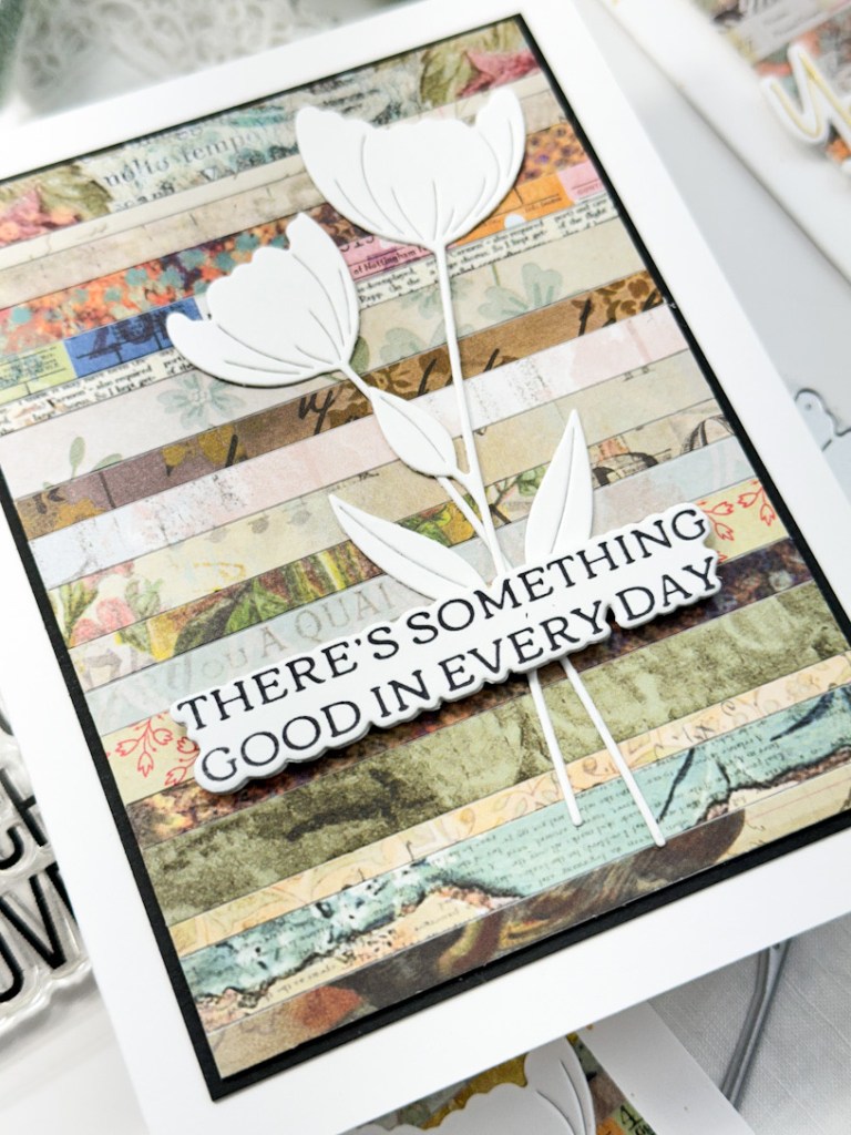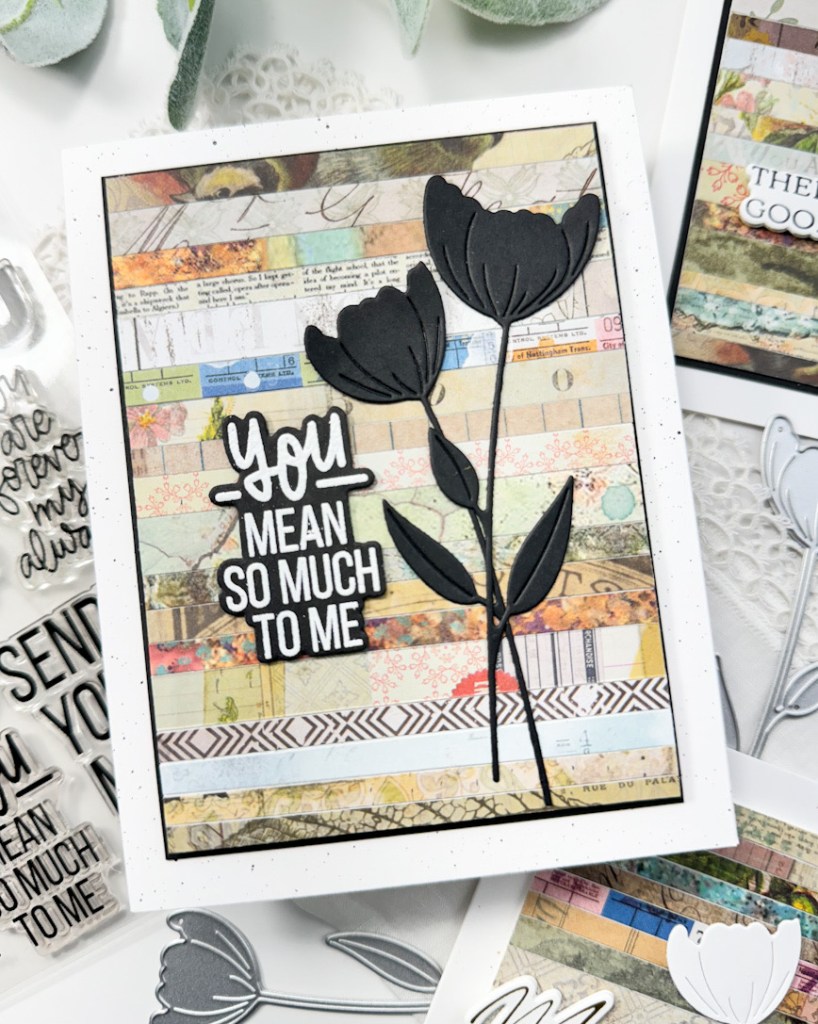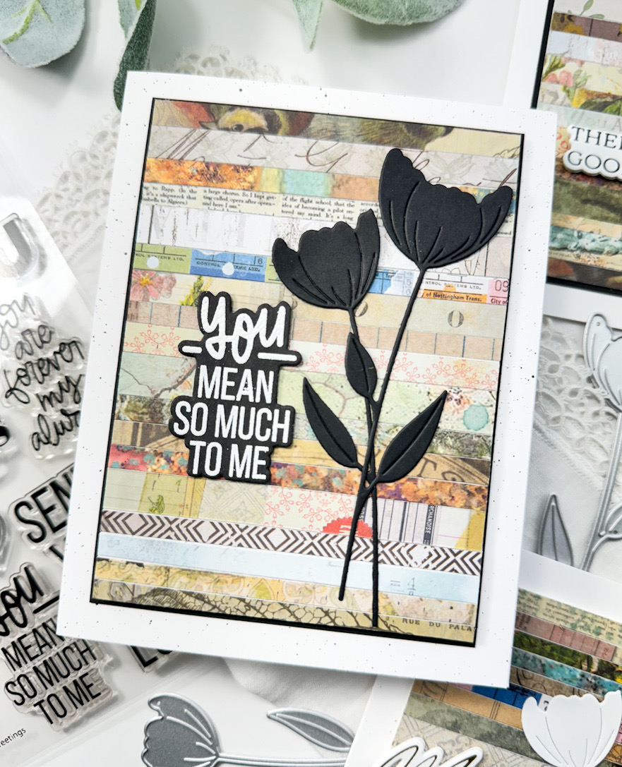 I layered some of the panels with black cardstock for a bit of a contrast, and splattered some of the card bases for additional interest. I used the SSS Etched Crocus Stems to cut several flowers in black and white and adhered those using liquid glue. I also used various sentiments that I thought would work for this design as well. I will list all of the products used below, if you’d like to reference them. All of the strip panels were adhered using foam tape for additional dimension.
